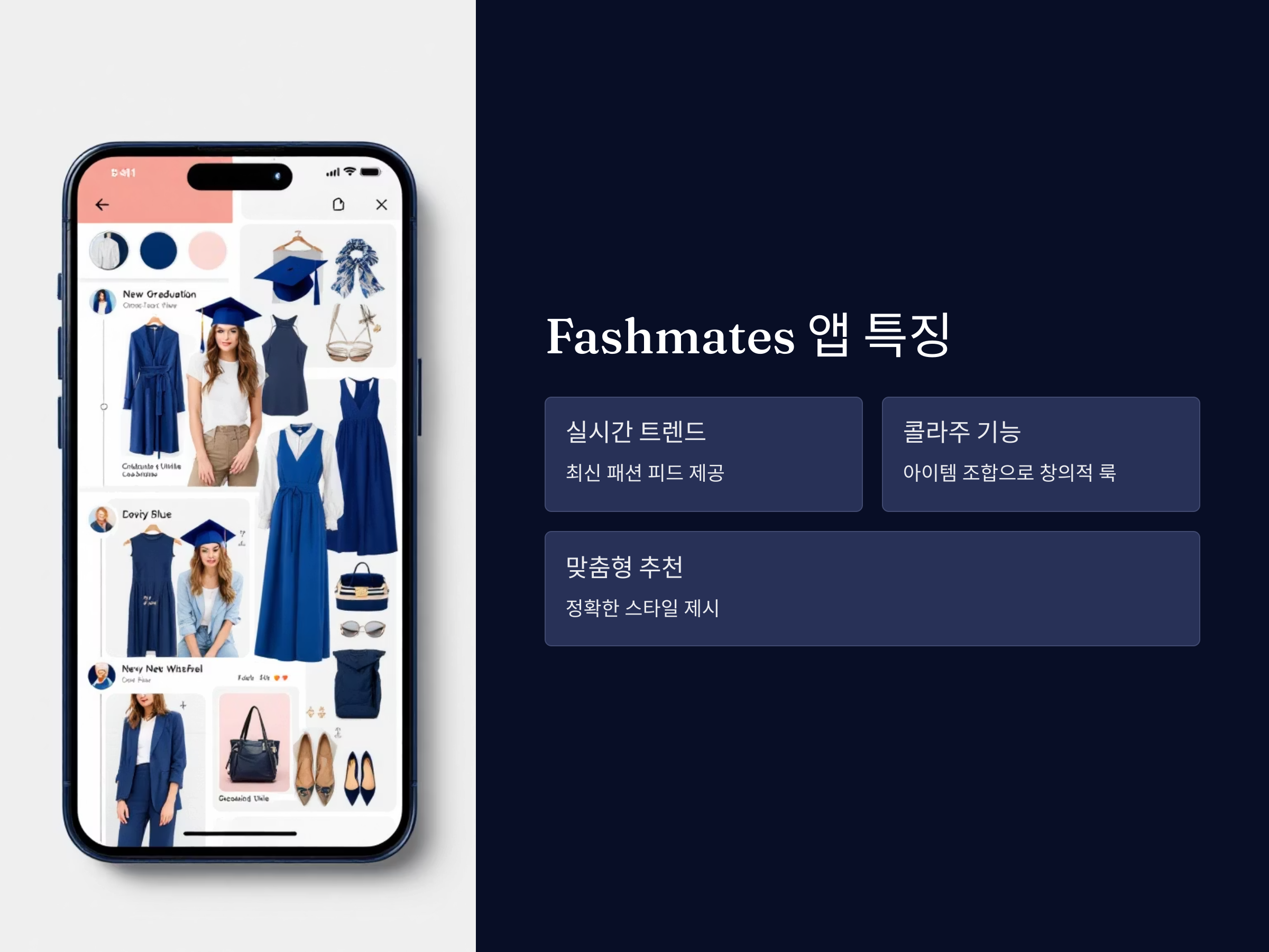 'Fashmates'는 유저가 자신만의 스타일을 창조할 수 있는 앱으로, 졸업식 의상 스타일링을 위한 완벽한 선택입니다. 이 앱은 패션 피드를 통해 최신 패션 트렌드를 실시간으로 확인할 수 있으며, 다양한 스타일 아이템을 조합하여 완벽한 룩을 만들 수 있습니다. 졸업식에 적합한 옷을 찾을 수 있도록 스타일링 가이드를 제공하고, 자신이 원하는 옷을 직접 찾아볼 수 있는 기능도 제공합니다.