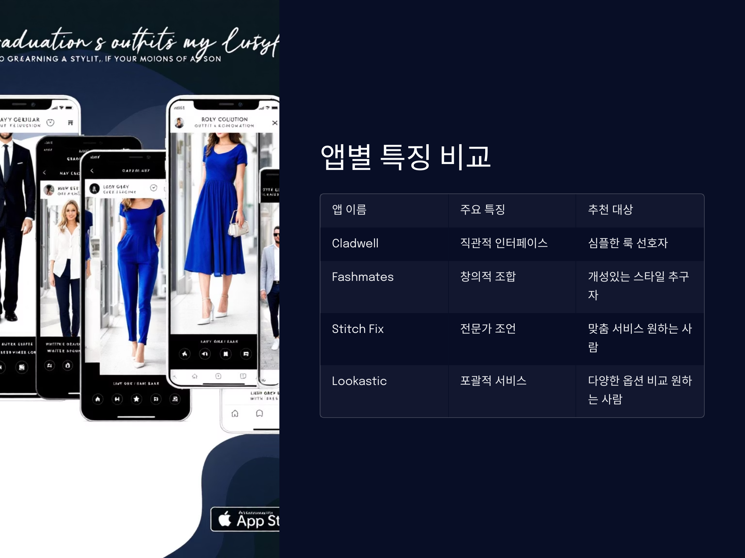 앱은 유저에게 각종 스타일링 팁과 패션 아이디어를 제공하여 졸업식 의상을 선택하는 데 매우 유용합니다. 'Lookastic'은 사용자가 자신에게 맞는 의상을 쉽고 빠르게 찾을 수 있도록 돕는 다양한 기능을 제공하며, 최신 트렌드에 맞춰 스타일을 제안해줍니다.