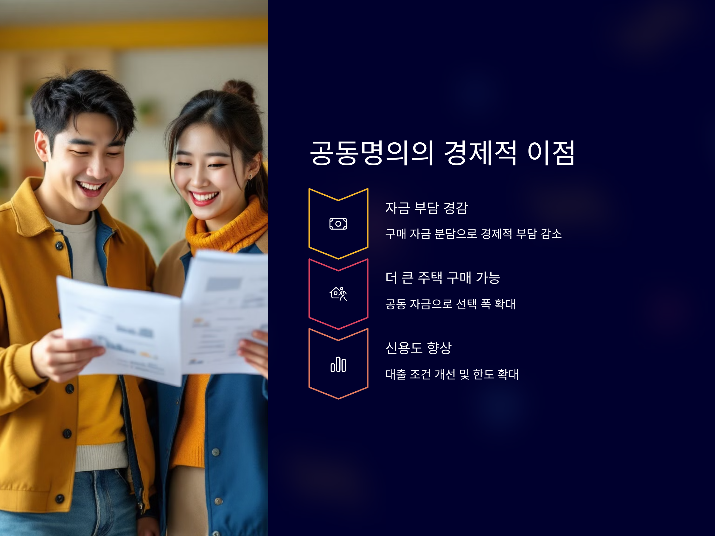 공동명의로 주택을 구매할 때, 신용도가 높은 사람과 함께 구입하면 대출을 받을 때 더 유리한 조건을 얻을 수 있습니다. 대출을 여러 사람의 명의로 받으면 대출 한도도 더 넓어지고, 상환 능력도 높게 평가받게 됩니다. 이를 통해 더 좋은 조건의 대출을 받을 수 있습니다.