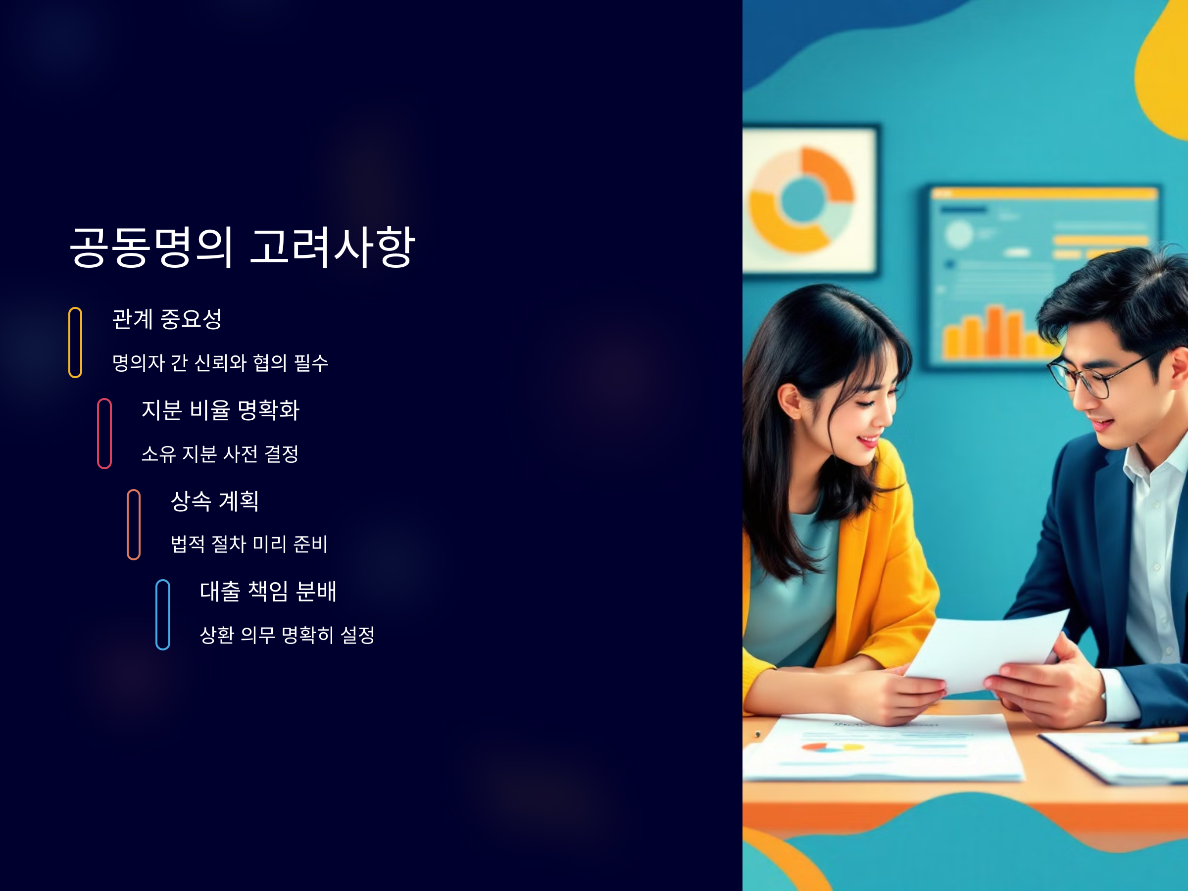 셋째, 상속과 관련된 문제를 미리 고민해야 합니다. 상속 문제는 공동명의자 간에 불필요한 갈등을 일으킬 수 있으므로, 이를 미리 대비하여 법적 절차나 상속 계획을 세우는 것이 좋습니다. 마지막으로, 대출 상환에 대한 명확한 책임을 분배하는 것이 중요합니다. 공동명의자들 간에 대출 상환 부담을 명확히 하고, 문제 발생 시 해결할 방법을 사전에 마련하는 것이 바람직합니다.