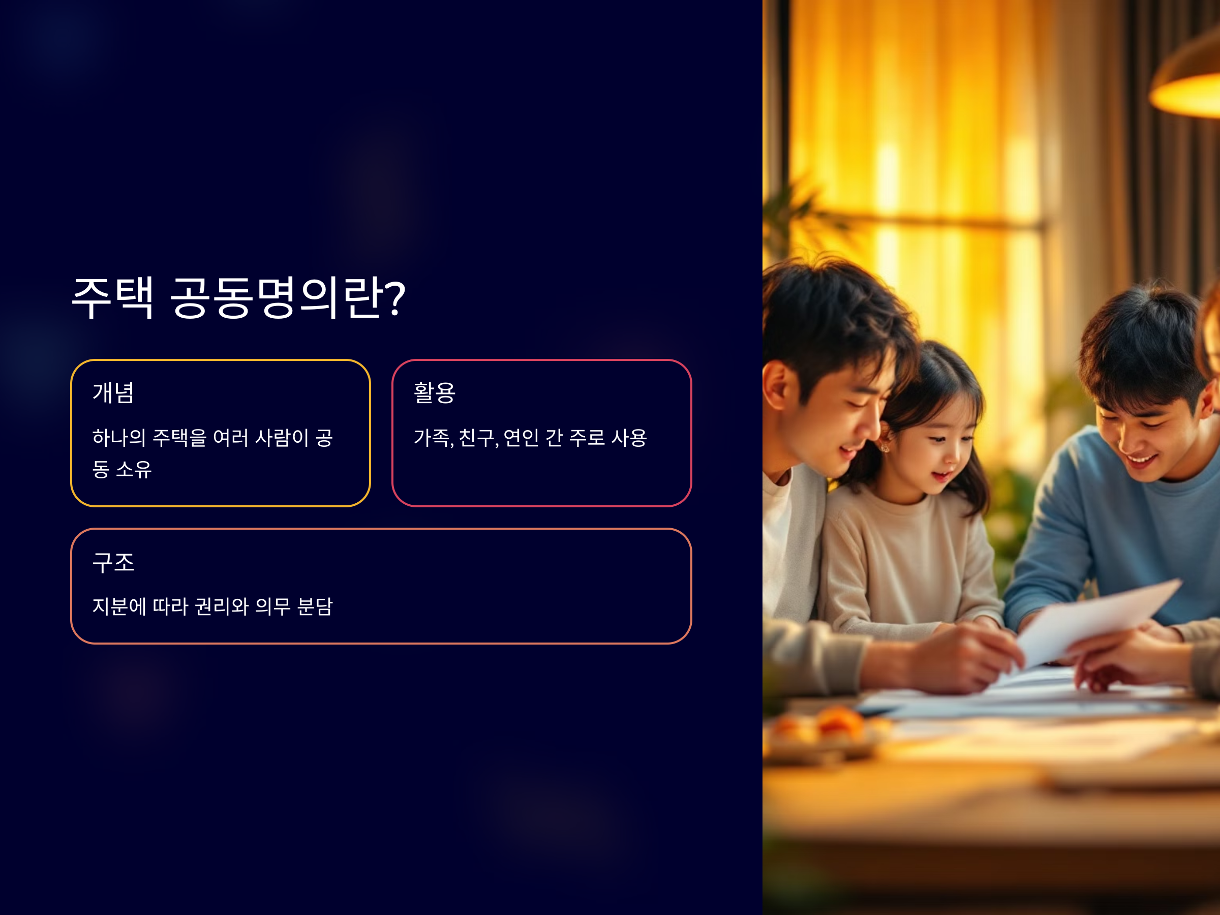 주택 공동명의란, 하나의 주택을 여러 사람이 공동으로 소유하는 방식입니다. 주로 가족 구성원 간이나 친구, 연인 사이에서 사용되는 방식으로, 주택을 공동으로 소유하고, 지분에 맞게 해당 주택에 대한 권리와 의무를 분담하는 구조입니다. 예를 들어, 부모와 자식이 공동명의로 주택을 구입하거나, 부부가 각각 지분을 나누어 주택을 구매하는 경우입니다.
