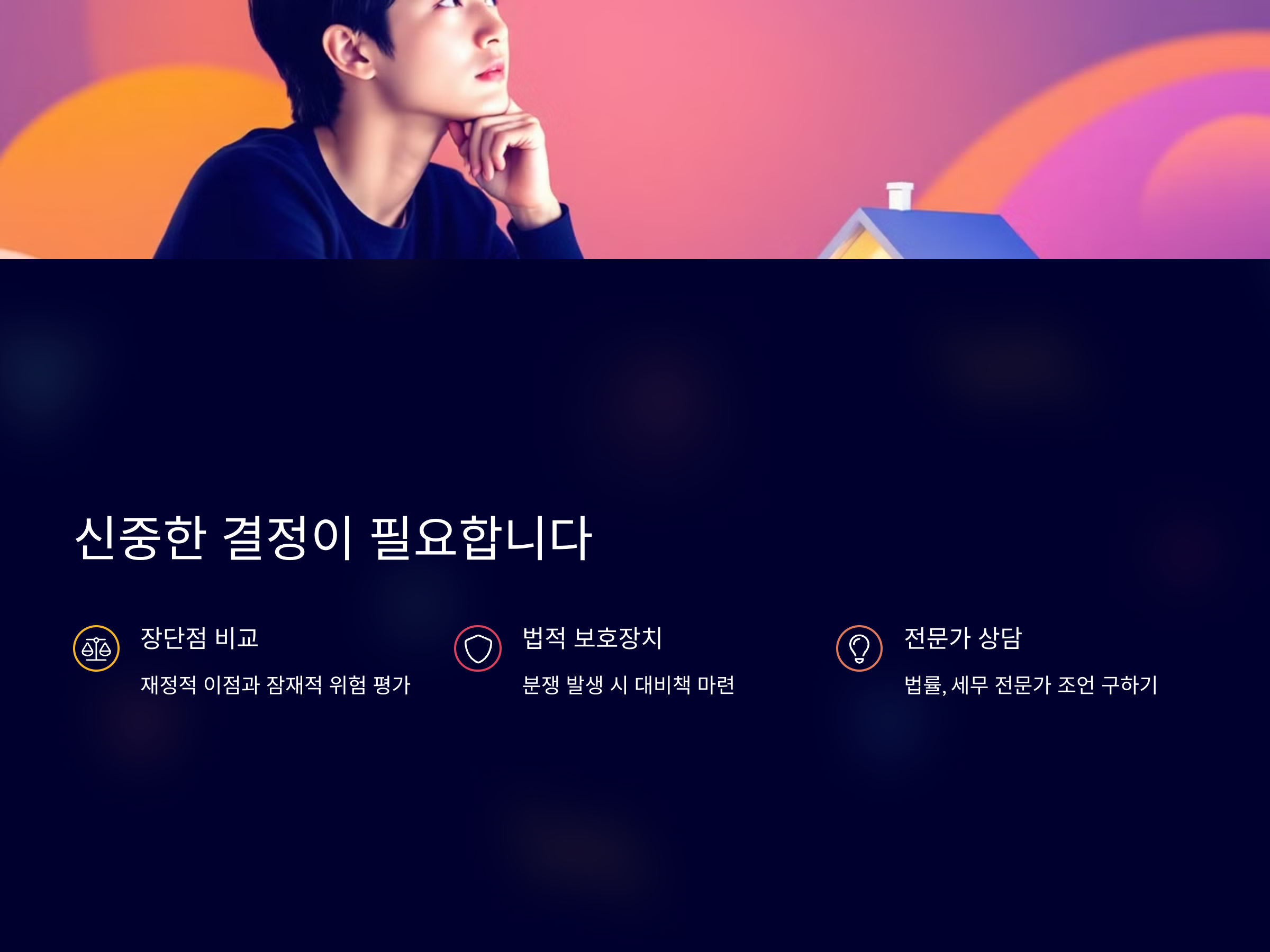 주택 공동명의는 여러 사람 간의 재정적 부담을 나누고, 세금을 절감하는 등의 장점이 있는 방식입니다. 하지만 동시에 소유권 분쟁이나 상속 문제, 대출 상환 부담 등의 단점도 존재합니다. 따라서 주택 공동명의를 고려할 때는, 각자의 권리와 의무를 명확히 하고, 장기적인 계획을 세워야 합니다. 또한, 공동명의자 간의 관계를 고려하여 신중한 결정을 내려야 합니다. 주택 공동명의가 여러분에게 적합한 선택인지 잘 판단한 후, 신중하게 결정하시기 바랍니다.