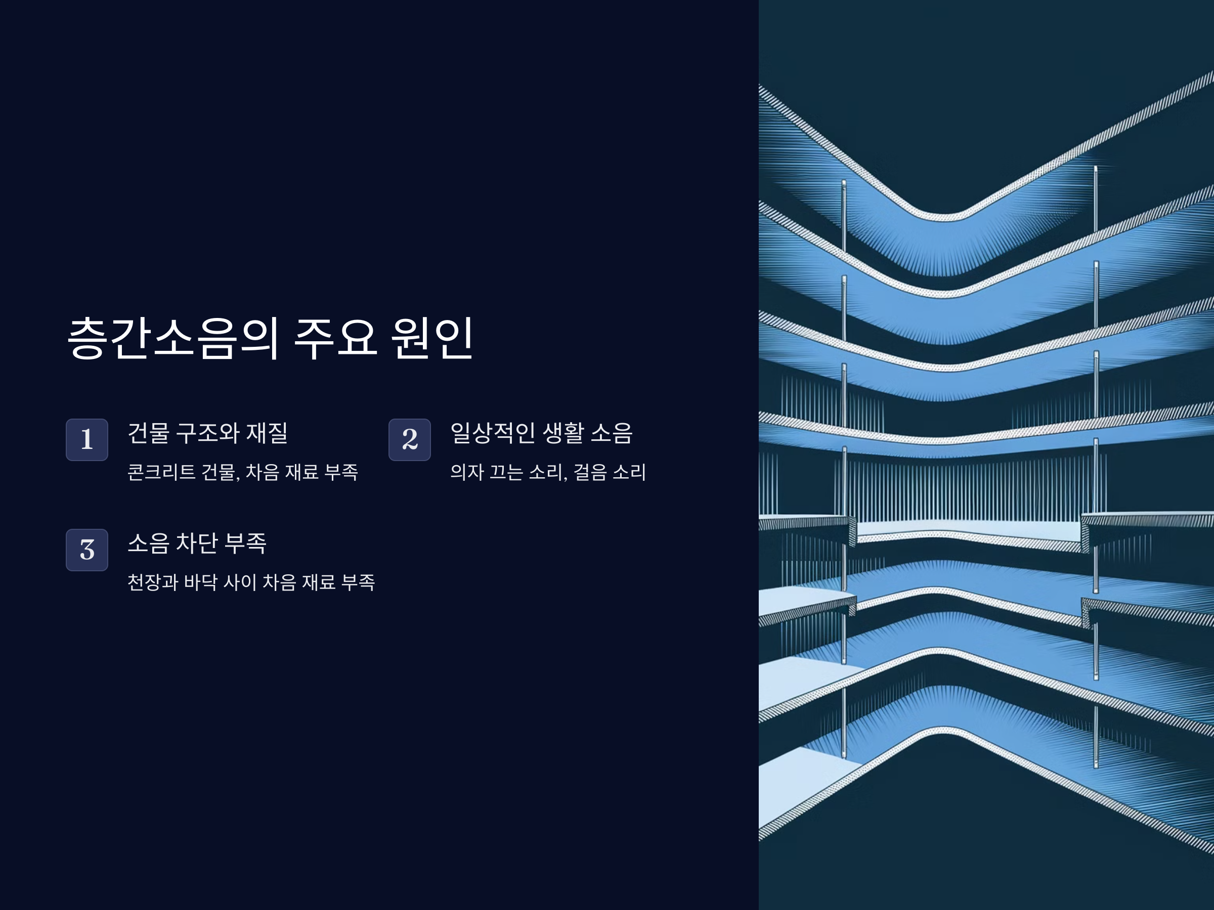 층간소음의 가장 큰 원인 중 하나는 바로 건물의 구조와 재질입니다. 특히, 콘크리트나 시멘트 건물은 소리가 잘 전달되기 때문에, 바닥이나 벽을 통한 소리의 전파가 빠릅니다. 또, 바닥에 아무런 차음 재료가 없다면 소음이 더 심해질 수 있습니다. 이로 인해 상층에서 발생한 소리가 하층으로 쉽게 전달됩니다.