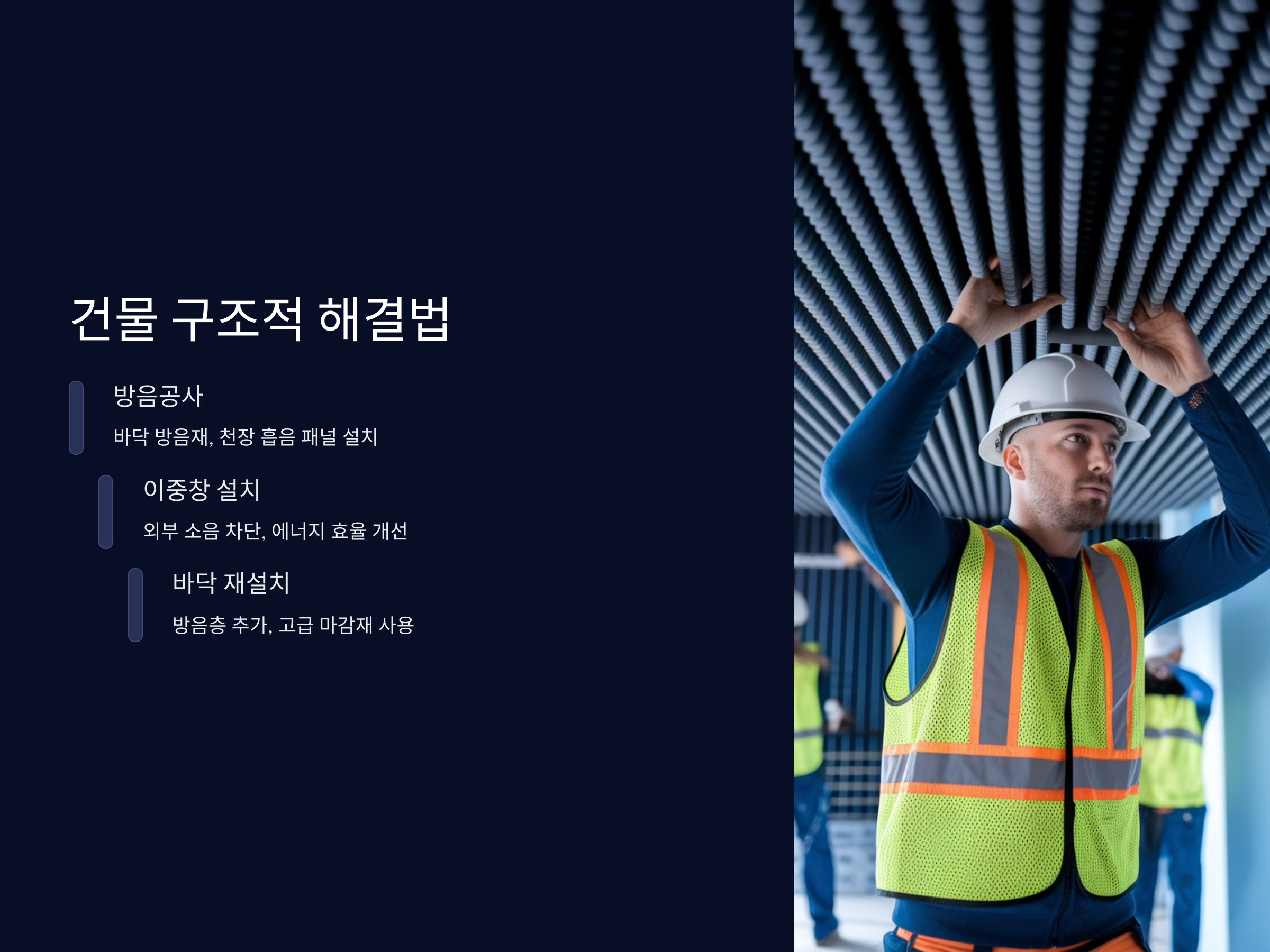 층간소음이 심각하다면, 건물의 구조적인 부분을 개선하는 것이 필요할 수 있습니다. 예를 들어, 바닥에 방음재를 추가하거나, 천장에 흡음 패널을 설치하는 등의 방법이 있습니다. 이는 전문적인 공사가 필요하기 때문에 비용이 발생할 수 있지만, 장기적으로 볼 때 소음을 크게 줄이는 효과가 있습니다.
