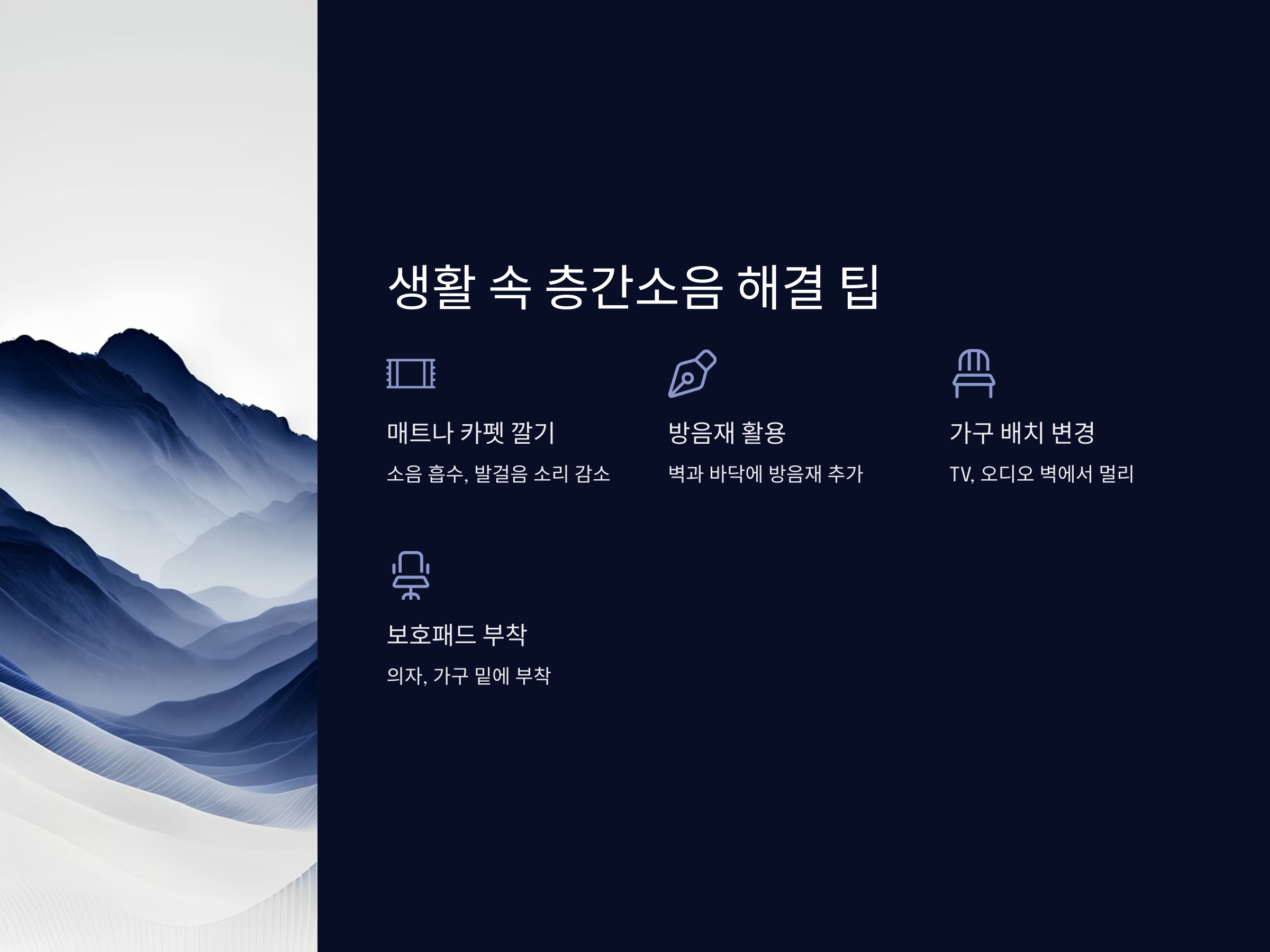 층간소음 문제는 한 번의 조치로 해결되기보다는 꾸준한 노력과 개선이 필요합니다. 가벼운 소음은 생활 습관을 바꾸는 것으로 해결할 수 있지만, 심각한 경우에는 구조적인 변경이 필요할 수 있습니다. 이를 해결하기 위해서는 개인의 노력과 함께 관리사무소, 전문가의 도움이 중요한 역할을 합니다. 여러분도 위에서 소개한 방법들을 적극적으로 실천해보세요.