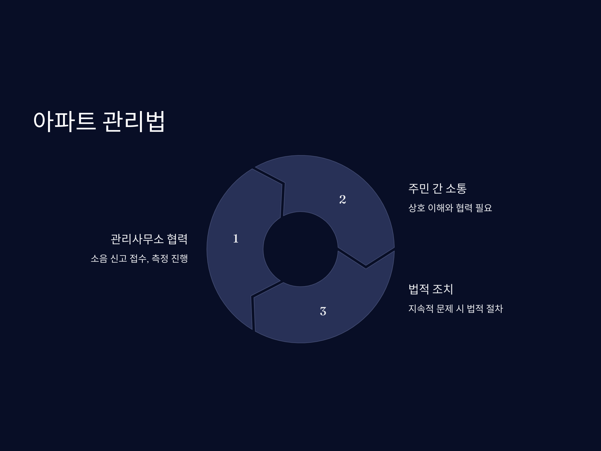 층간소음을 해결하려면 주민 간의 소통이 매우 중요합니다. 문제가 발생했을 때 서로를 이해하고 협력하는 자세가 필요합니다. 관리사무소에서는 소음 문제에 대한 인식 개선을 위한 캠페인을 진행하거나, 주민들이 소음에 민감하게 반응하지 않도록 교육할 수 있습니다.