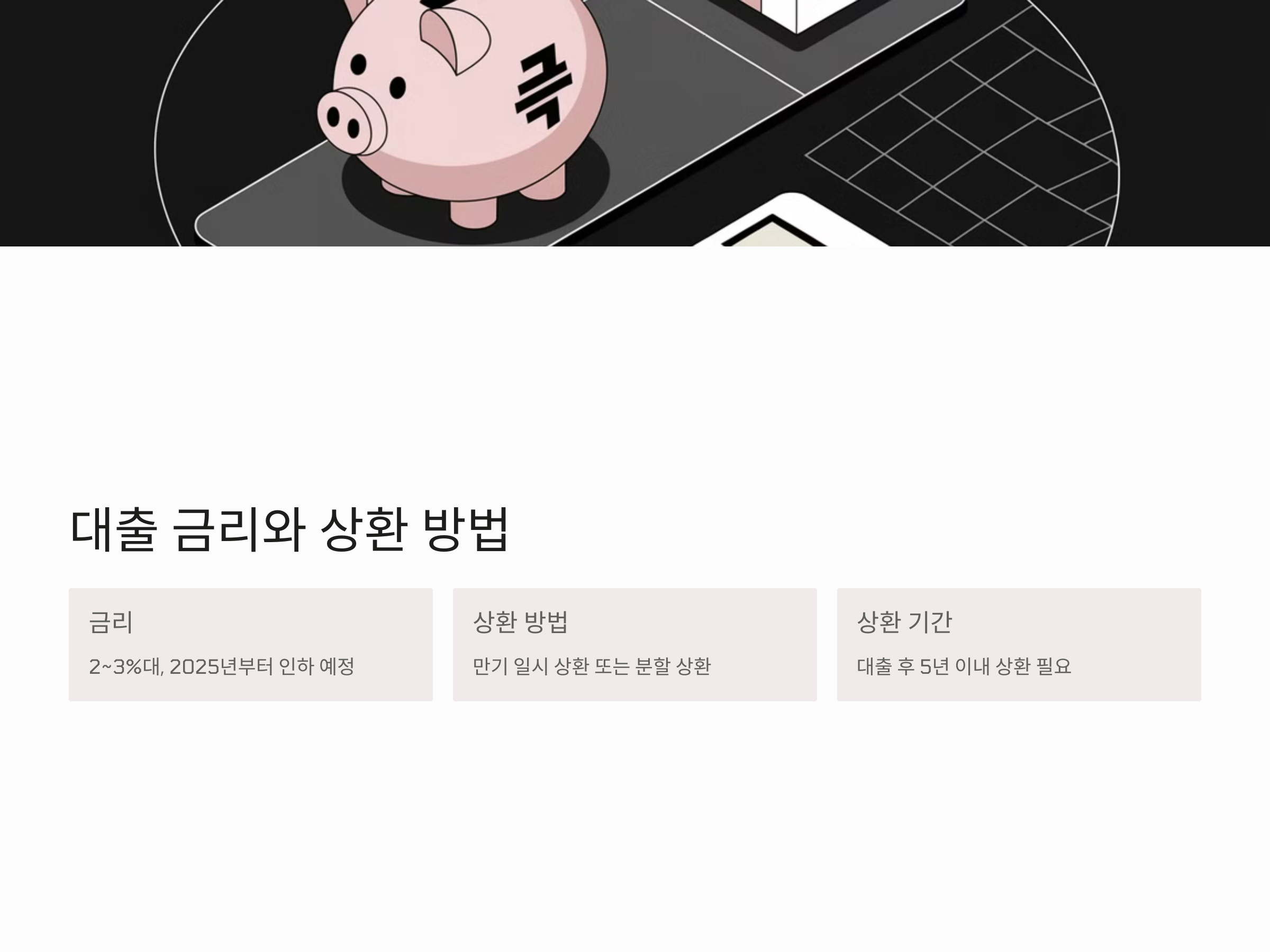 - 금리: 2025년부터 금리가 인하될 예정이지만, 기본적으로 대출 금리는 2~3%대입니다. 대출 금리는 대출자의 신용 상태와 대출 한도에 따라 달라질 수 있습니다.