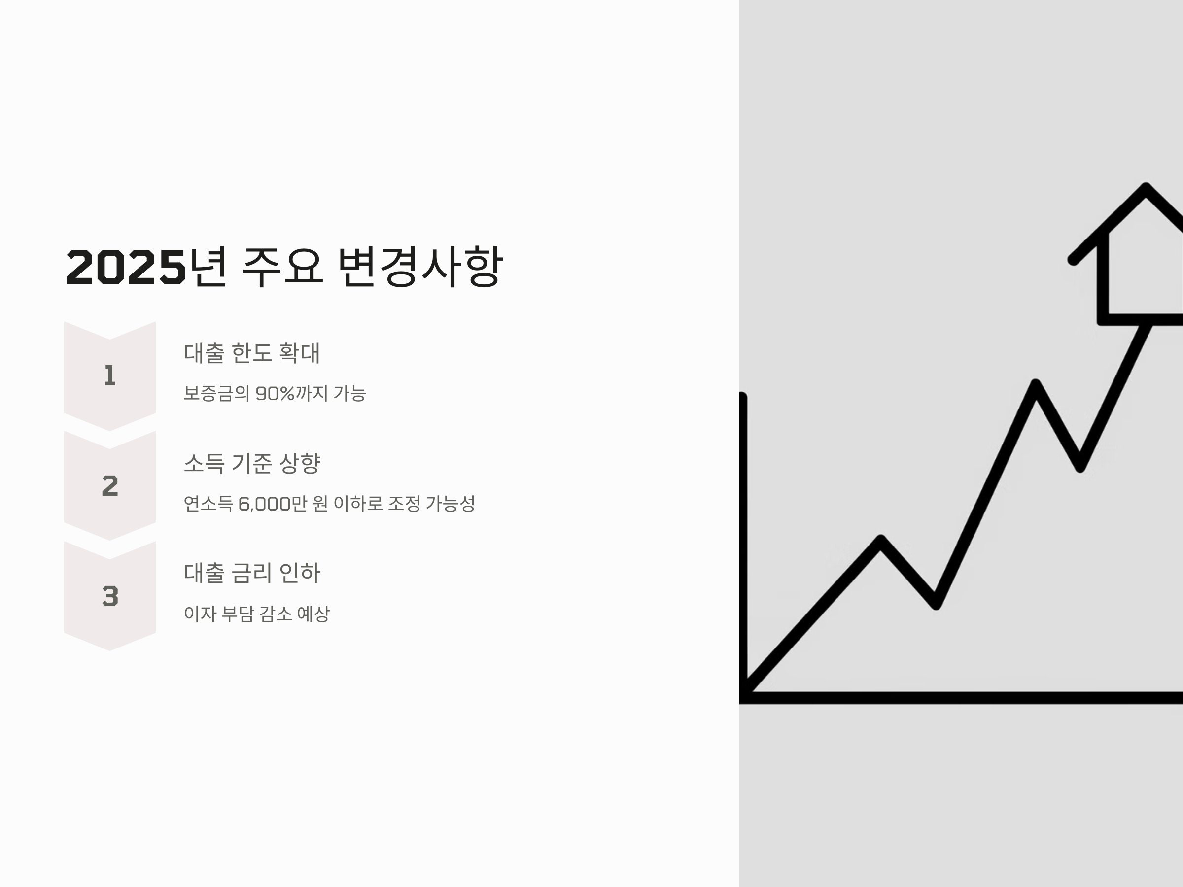 - 대출 한도 확대: 기존에는 전세보증금의 최대 80%까지만 대출이 가능했으나, 2025년부터는 대출 한도가 상향되어 보증금의 90%까지 대출을 받을 수 있습니다.