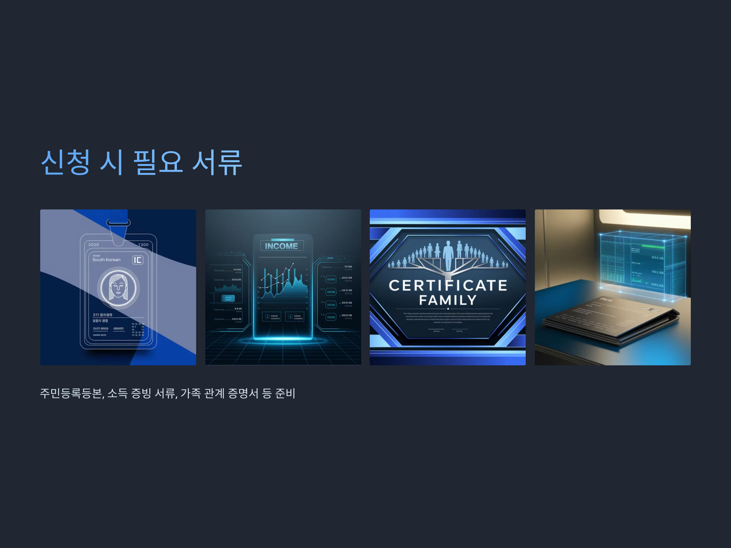 - 서류 제출: 신청서 작성 후, 필요한 서류를 제출해야 합니다. 서류 제출은 온라인으로 진행되며, 주민등록등본, 소득 증빙 서류, 가족 관계 증명서 등 기본 서류가 필요합니다.
