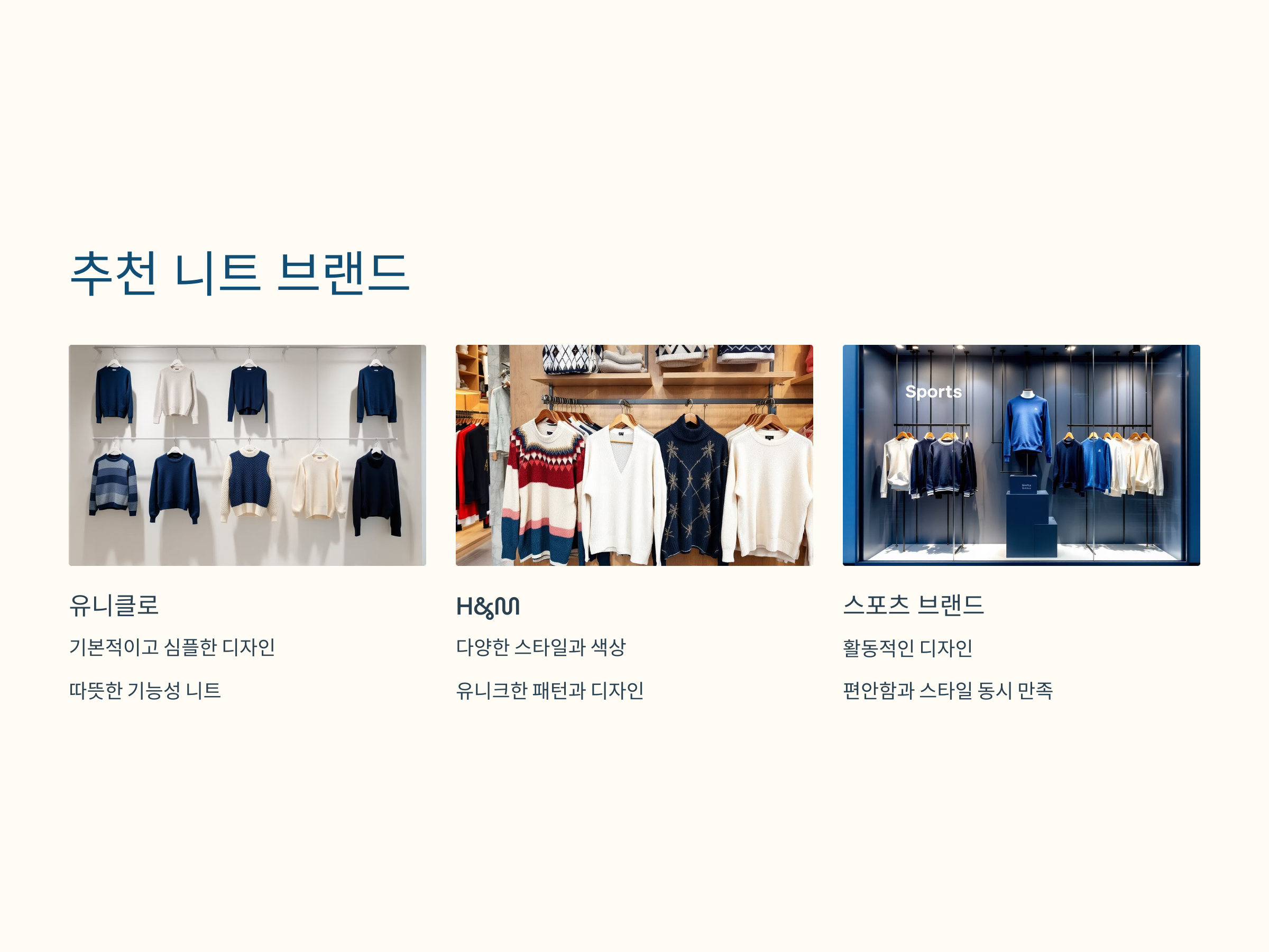 유니클로는 기본적이고 심플한 디자인의 니트를 찾을 수 있는 곳입니다. 여기에 추가로 따뜻한 기능성 니트를 제공하여 겨울철에도 유용하게 착용할 수 있습니다. 가격대도 합리적이어서 학생들에게 인기가 많습니다.