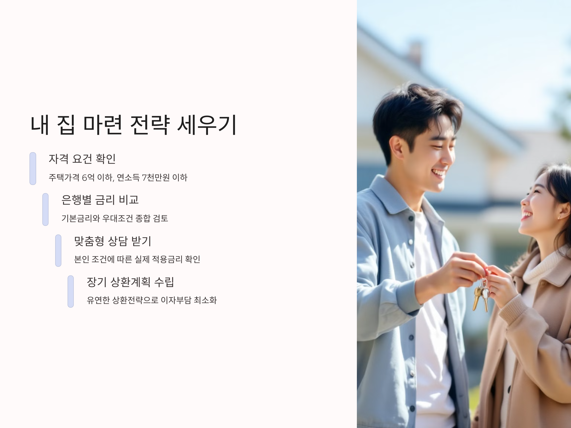 특히 2025년부터는 최장 50년까지 만기가 늘어나면서 청년층과 신혼부부를 위한 부담 경감 효과가 더욱 확대되었으며, 중도상환수수료가 면제되어 상환 전략을 유연하게 세울 수 있게 되었습니다. 또한 신청 자격도 주택 가격 6억원 이하, 연 소득 7천만원 이하(맞벌이 1억원 이하) 등으로 설정되어 있어 현실적인 조건에 부합합니다. 이처럼 보금자리론은 자격 요건만 충족된다면 시중은행보다 훨씬 유리한 조건을 제공받을 수 있어, 내 집 마련을 고민하는 분들에겐 반드시 검토해야 할 상품입니다.