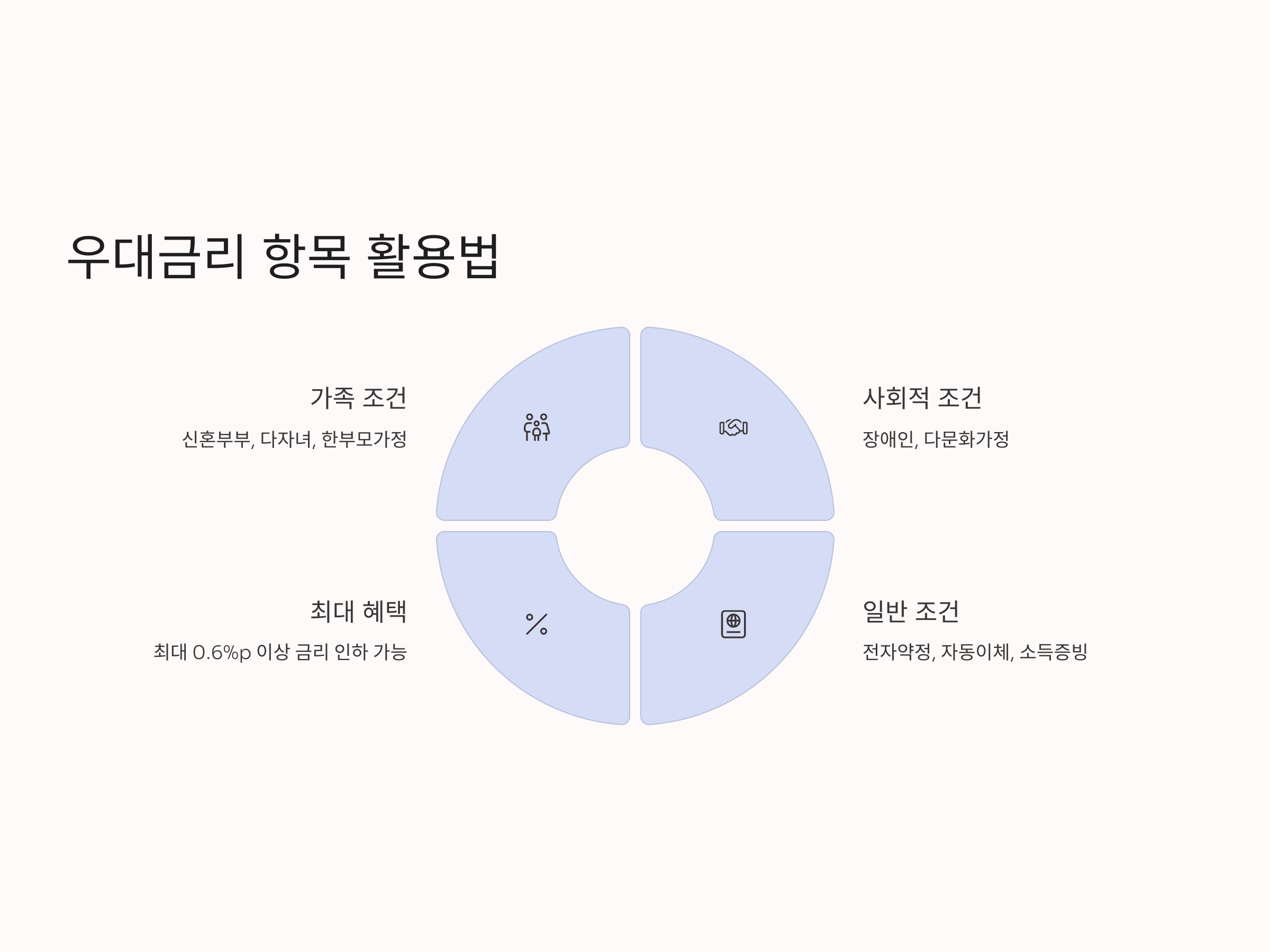각 우대 조건은 중복 적용이 가능하며, 최대 0.6%p 이상 금리를 낮출 수 있기 때문에 반드시 체크해야 할 요소입니다. 특히 자신이 속한 사회적 조건에 따라 예상보다 훨씬 낮은 금리를 받을 수 있으므로, 신청 전 충분한 확인이 필요합니다.