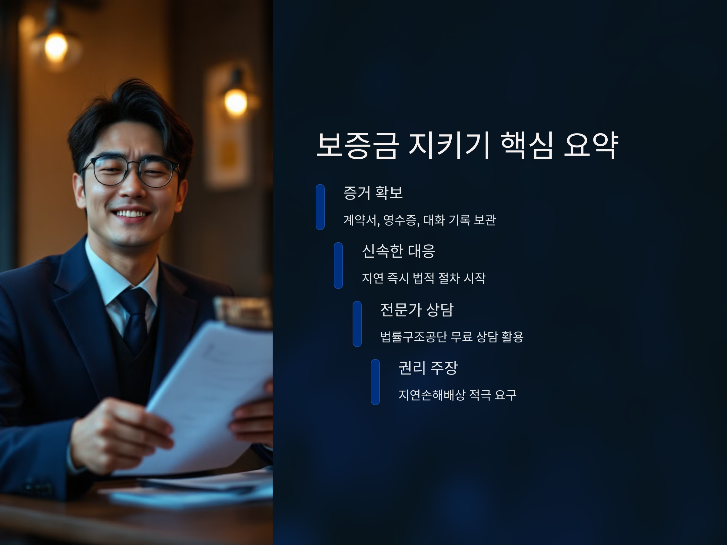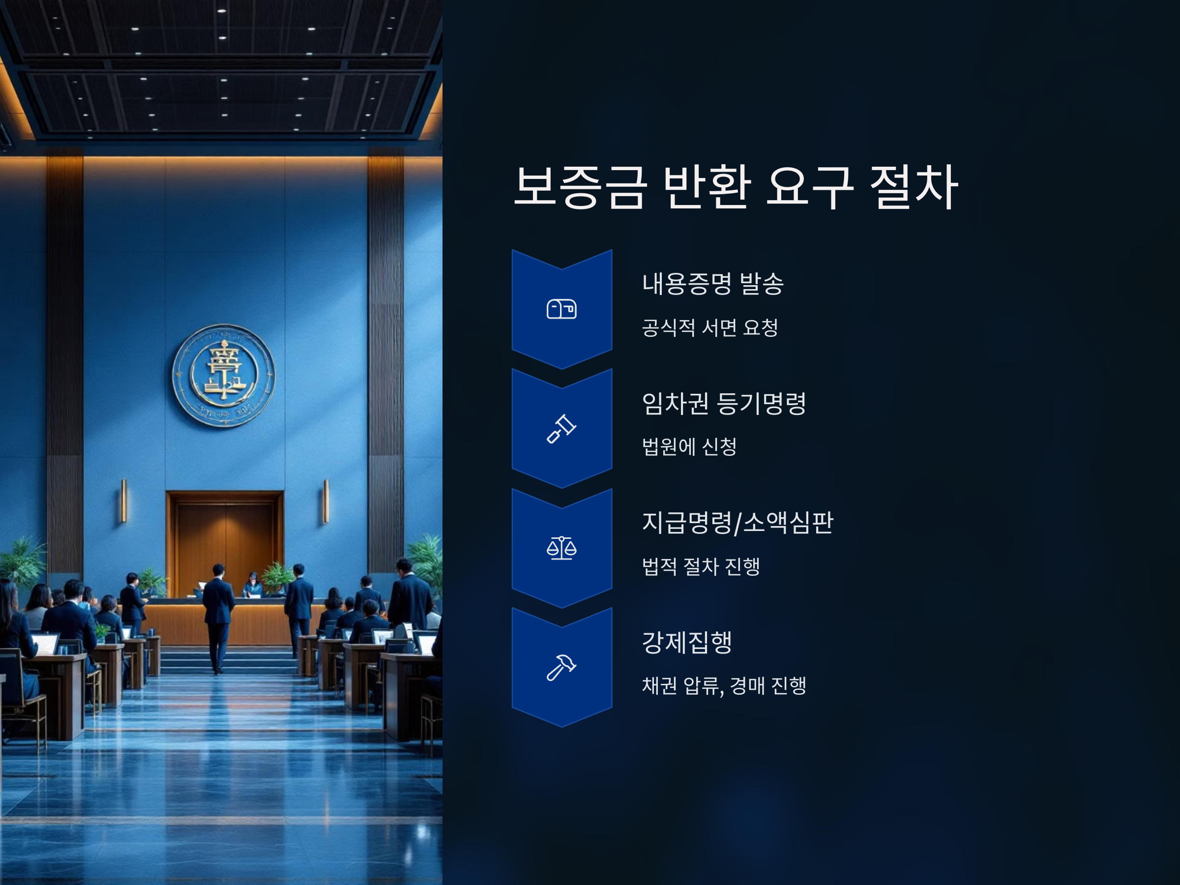 보증금 반환을 위한 절차는 단순해 보이지만 꼼꼼히 진행하지 않으면 시간만 허비하게 됩니다. 첫 단계는 계약 종료일 이후 집주인에게 정식으로 내용증명을 보내는 것입니다. 이후에도 반환이 이루어지지 않는다면 임차권 등기명령을 신청하거나, 민사소송을 통해 보증금 청구 및 지연손해배상을 함께 청구할 수 있습니다.