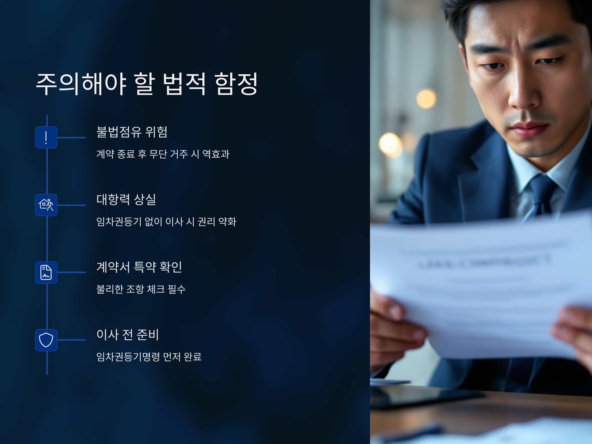 보증금 반환을 요구할 때 간과하기 쉬운 부분은 ‘불법점유’ 문제입니다. 계약이 끝났다고 해서 무조건 거주를 계속하면 오히려 불법점유로 간주되어 집주인이 반대로 손해배상을 청구할 수 있습니다. 또한 임차권등기명령을 신청하지 않고 이사를 나갈 경우, 대항력이 상실되어 보증금을 돌려받기 어려워질 수 있습니