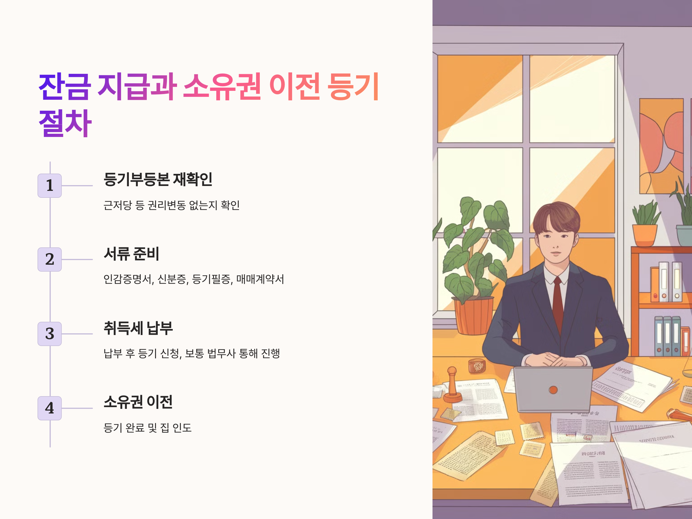 잔금 지급은 거래의 최종 단계로, 잔금을 지급하는 날 소유권 이전 등기와 집의 인도도 함께 진행됩니다. 이때는 매수자가 등기부등본을 다시 확인해 근저당 등 권리변동이 없는지 확인하고, 이전 등기를 위한 서류를 준비해야 합니다. 필요한 서류는 매도인의 인감증명서, 신분증, 등기필증, 매매계약서 등이 있으며, 매수인은 취득세 납부 후 등기를 신청합니다. 보통 등기는 법무사를 통해 진행하며, 진행 과정과 수수료도 사전에 확인해야 불필요한 비용을 막을 수 있습니다.