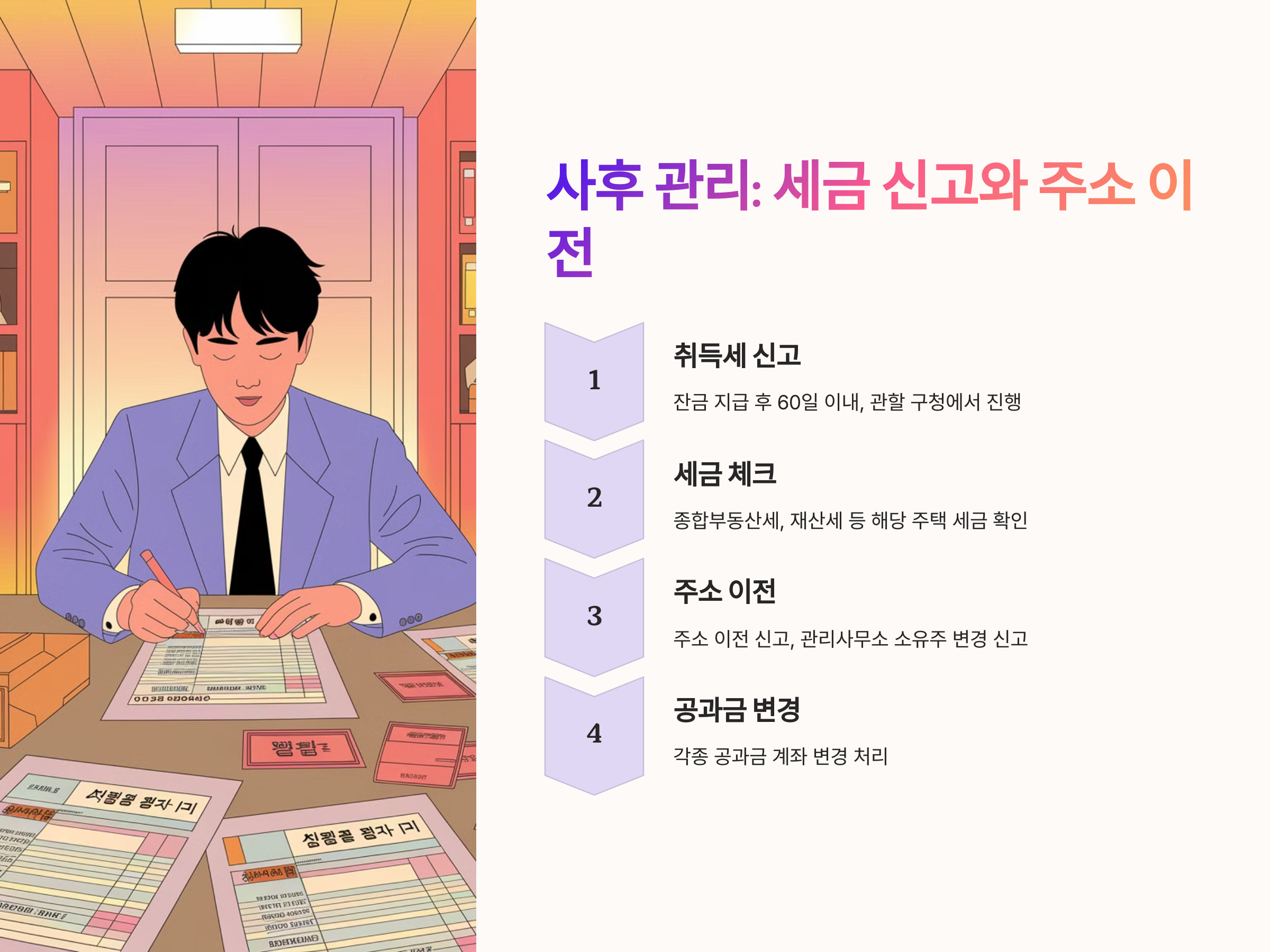 매매가 완료되었다고 끝이 아닙니다. 취득세 신고 및 납부는 잔금 지급 후 60일 이내에 해야 하며, 관할 구청에서 이뤄집니다. 이외에도 종합부동산세, 재산세 등 해당 주택의 세금을 체크하고, 주소 이전 신고도 빠르게 마무리해야 합니다. 만약 임대사업자 등록을 고려한다면, 추가적인 세제 혜택과 의무사항도 함께 살펴야 합니다. 또한, 관리사무소에 소유주 변경 신고를 하고, 각종 공과금 계좌 변경도 놓치지 말아야 합니다.