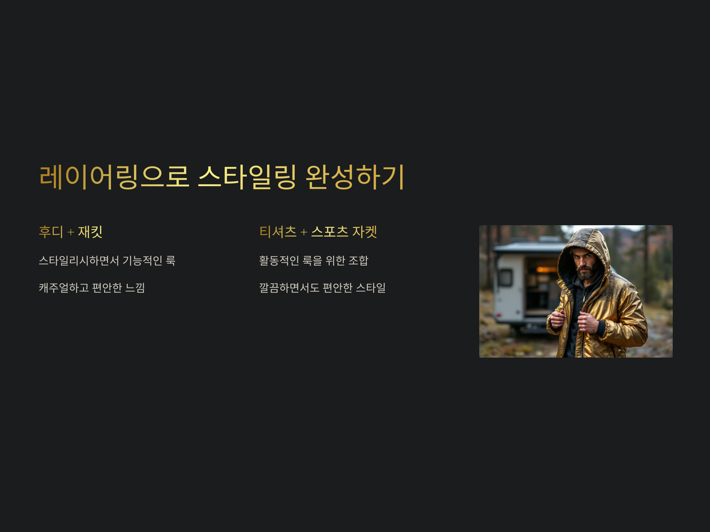 - 후디 + 재킷: 후디와 재킷을 함께 매치하면 스타일리시하면서도 기능적인 룩을 연출할 수 있습니다. 후디는 차박 스타일을 캐주얼하고 편안하게 만들어 주며, 재킷은 외부 활동에 적합한 보호 기능을 추가합니다.