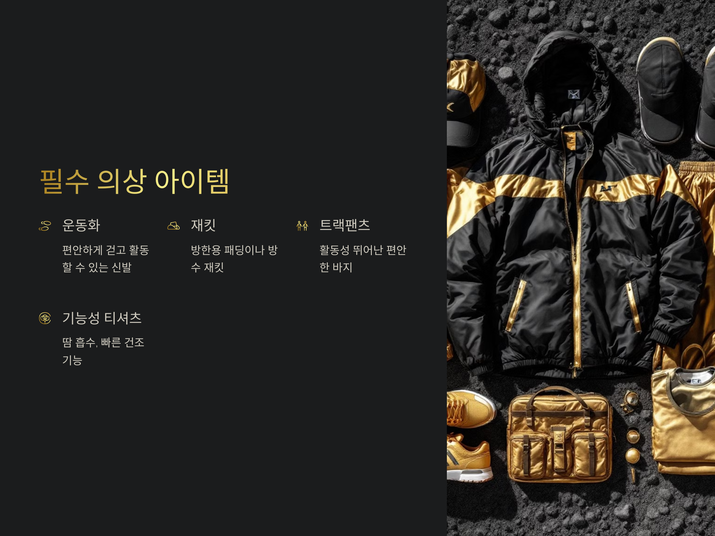차박 스포티룩을 연출하려면 다양한 의상 아이템들이 필요합니다. 이를테면, 운동화, 재킷, 트랙팬츠, 기능성 티셔츠 등이 기본 아이템으로 포함됩니다. 이들 각각의 아이템은 차박에 적합하면서도 스타일리시한 분위기를 자아냅니다.