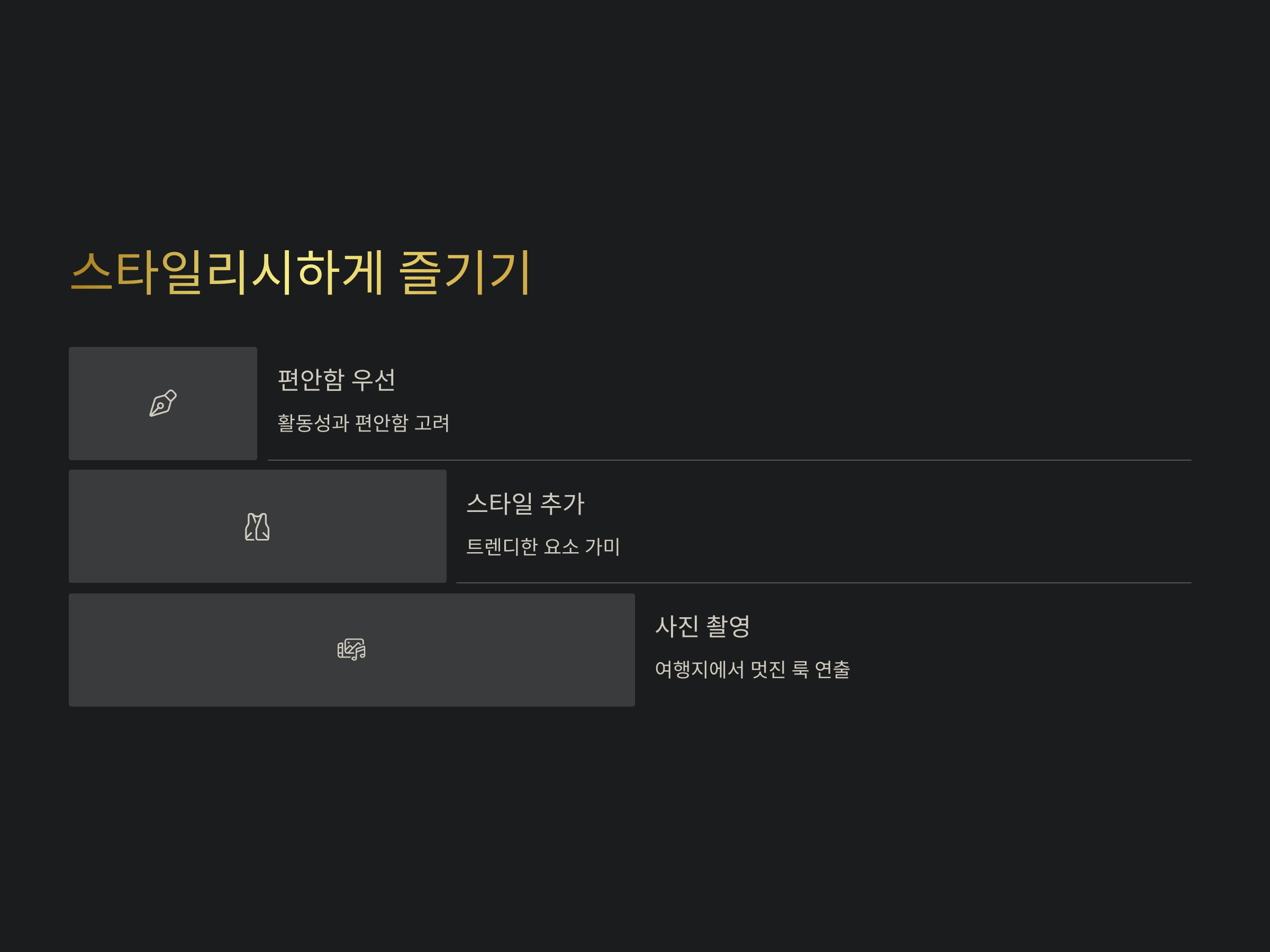 스포티룩을 연출할 때 중요한 요소는 바로 '활동성'입니다. 차박 여행에서는 주로 바깥 활동이 많기 때문에 움직임이 편안하고 활동적인 느낌을 주는 옷을 선택해야 합니다. 또한, 날씨와 환경에 따라 레이어링을 적절히 활용할 수 있는 의상도 필수입니다.