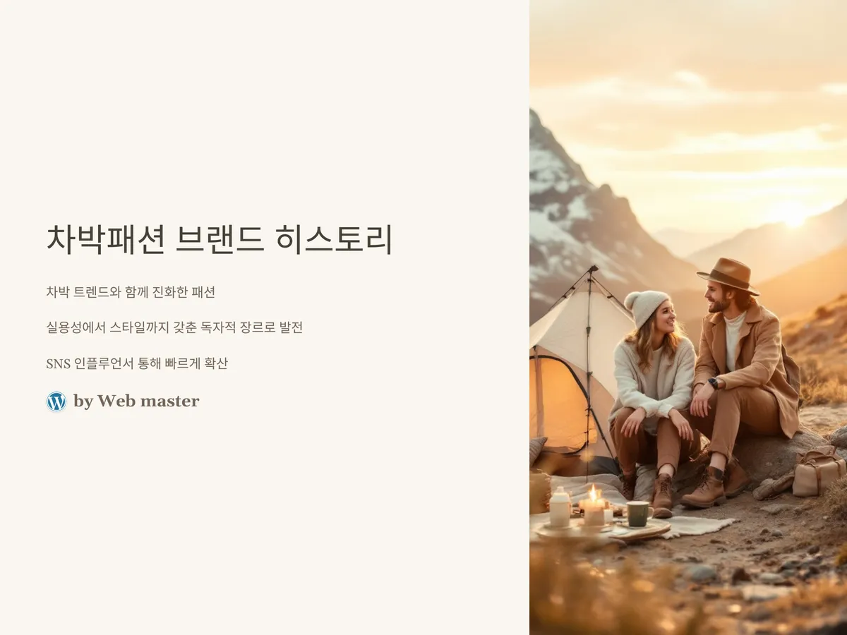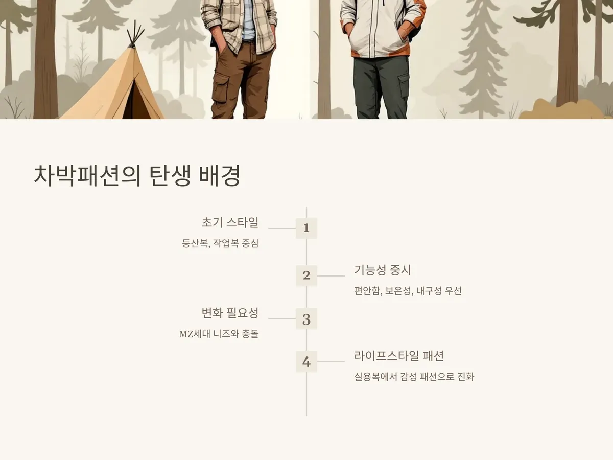 차박의 시초는 단순히 차에서 잠을 자는 것을 의미했지만, 시간이 지나며 캠핑과 여행, 아웃도어 활동이 결합된 새로운 문화로 자리 잡게 되었다. 초기에는 등산복이나 작업복 같은 기능성 의류가 차박 스타일의 대부분을 차지했으며, 이는 편안함과 보온성, 내구성을 중시한 결과였다. 특히, 코오롱스포츠, K2 같은 기존 아웃도어 브랜드들이 제공하는 아이템들이 차박족의 선택을 받았다.