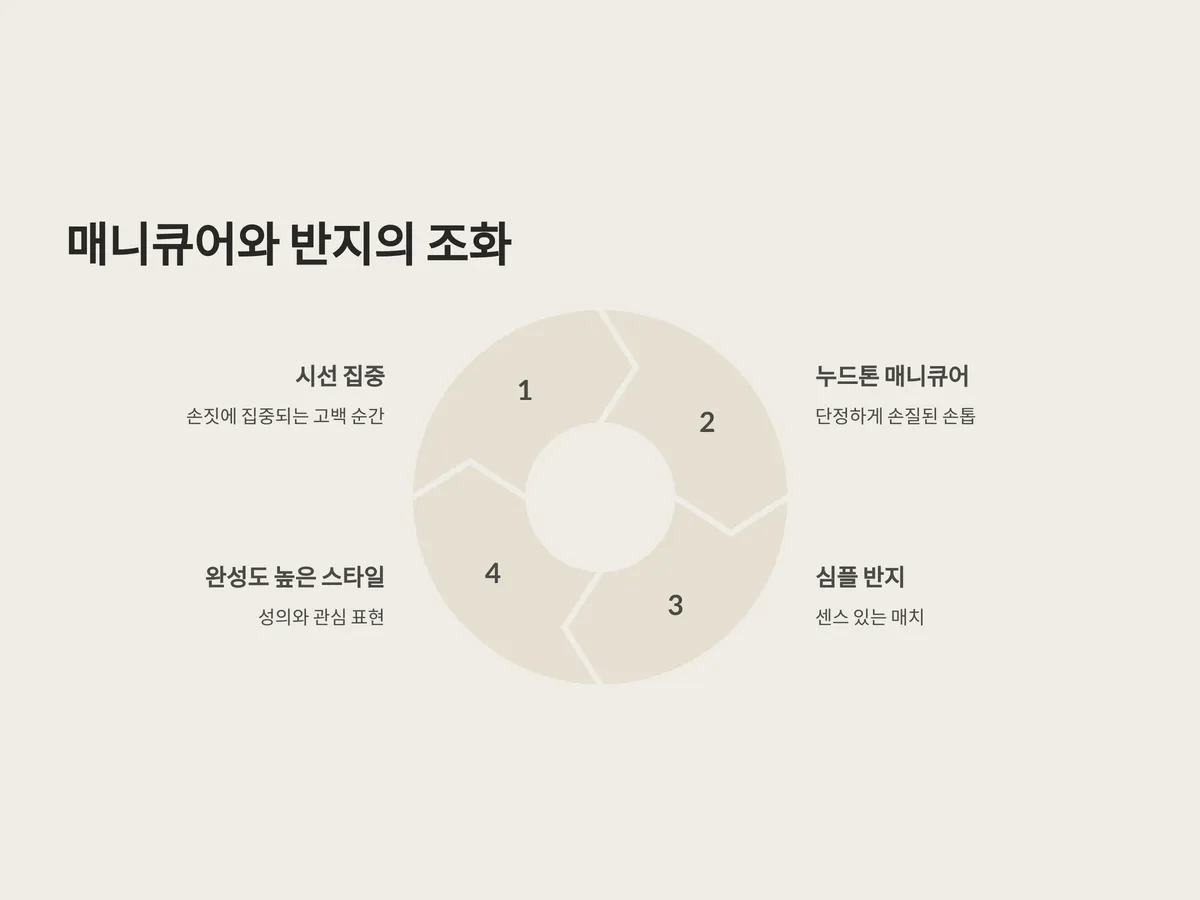 은은한 누드톤 매니큐어에 심플한 반지 하나만으로도 감각적인 연출이 가능하며, 이는 성의와 관심을 표현하는 제스처로 작용합니다. 손에 힘을 빼되, 애정을 담은 디테일로 차별화된 이미지를 줄 수 있습니다.