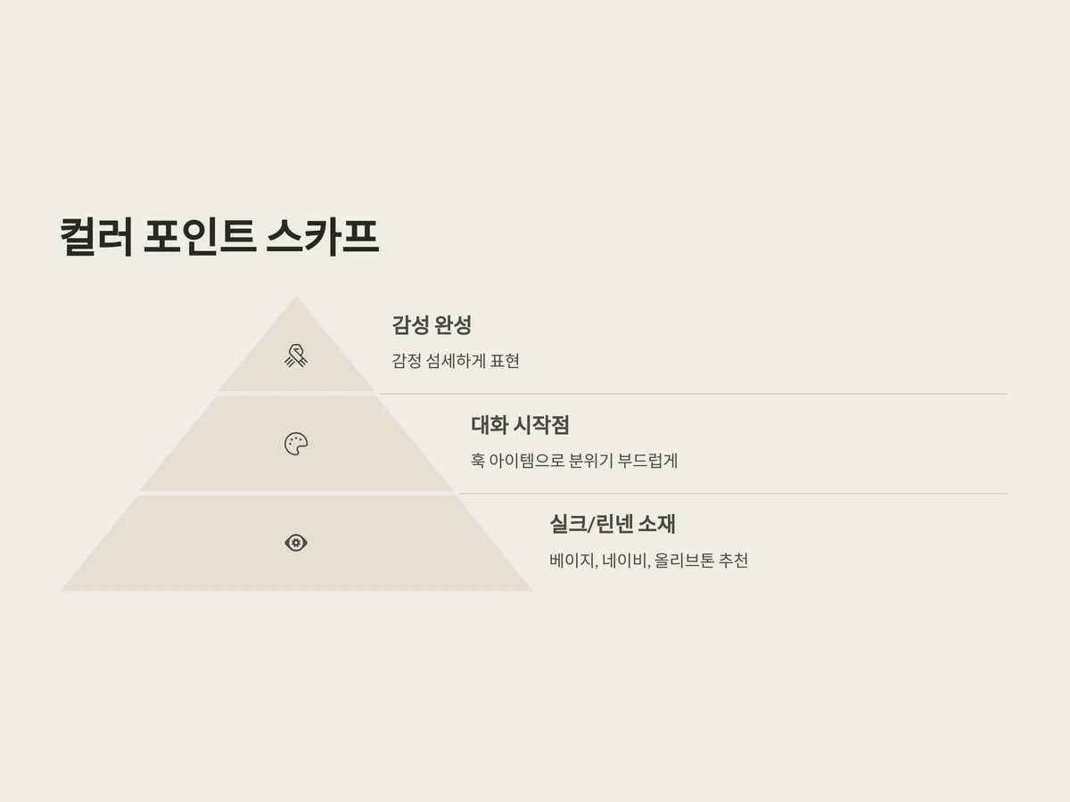 남녀 모두 착용 가능한 실크나 린넨 소재의 스카프는 사계절 활용이 가능하며, 자연스러운 포인트로 개성을 드러내기에 좋습니다. 특히 베이지, 네이비, 올리브톤의 색상은 계절과 상관없이 고백 분위기와 잘 어우러집니다.