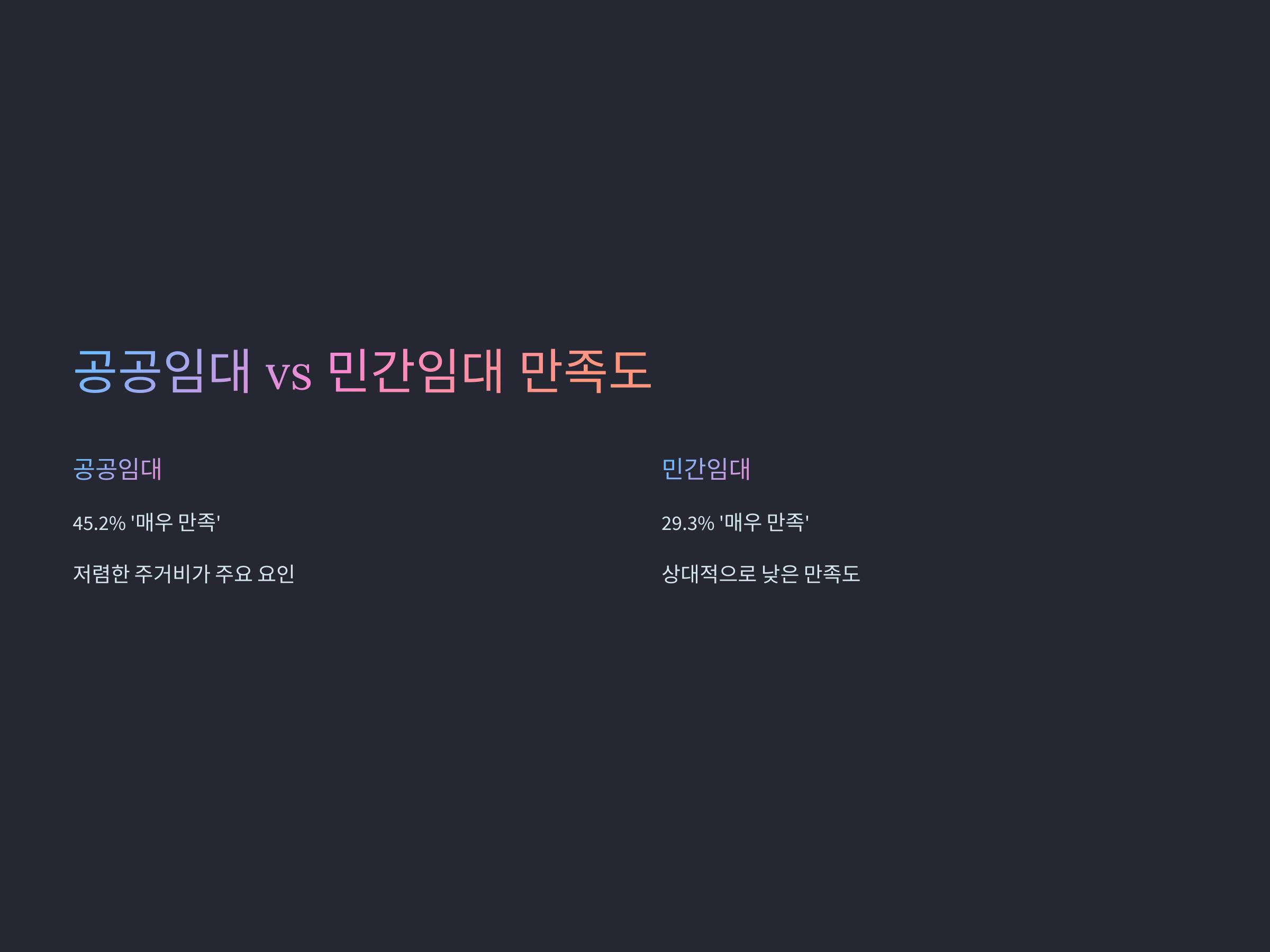 청년안심주택은 공공임대와 민간임대로 구분하여 공급되고 있습니다. 조사 결과, 공공임대 입주자의 45.2%가 '매우 만족'을 선택한 반면, 민간임대 입주자는 29.3%만이 '매우 만족'을 선택하여 공공임대 입주자의 만족도가 더 높은 것으로 나타났습니다. 이는 공공임대의 경우 시세 대비 저렴한 주거비로 인해 주거비 부담이 감소한 것이 주요 요인으로 작용한 것으로 보입니다. citeturn0search6
