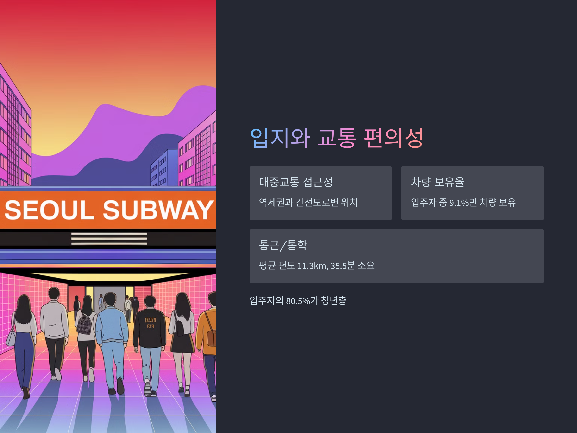 청년안심주택은 역세권과 간선도로변에 위치하여 대중교통 접근성이 우수합니다. 조사 결과, 입주자의 80.5%가 청년층으로, 차량 보유 비율은 9.1%에 불과하여 대중교통 지향형 청년 주거 모델로서의 장점이 부각되고 있습니다. 또한, 통근 및 통학 거리는 평균 편도 11.3㎞, 소요 시간은 35.5분, 비용은 1910원으로 나타나 직주 근접에 기여하고 있습니다. citeturn0search5