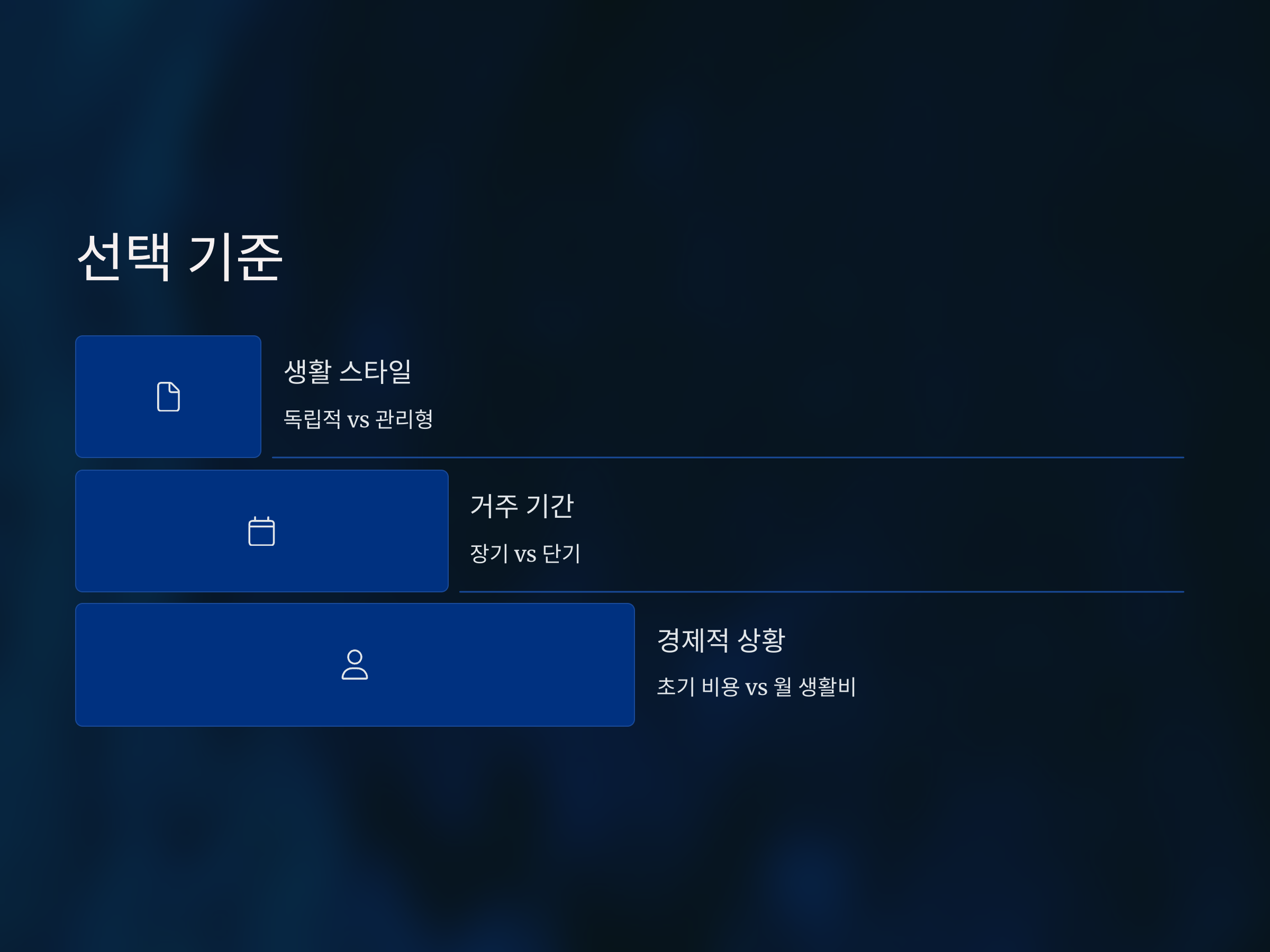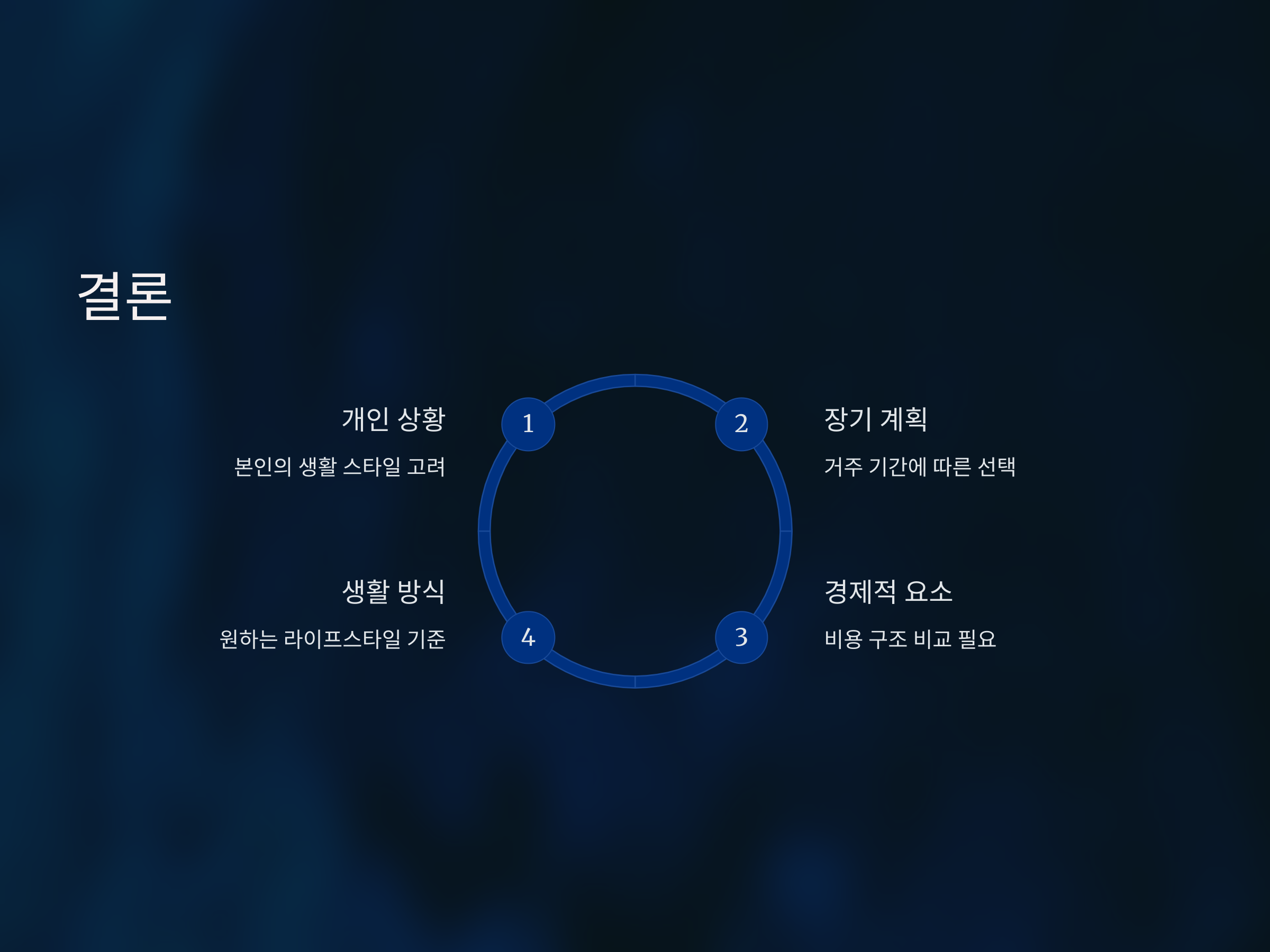 어떤 선택이든, 중요한 것은 본인이 원하는 라이프스타일을 기준으로 결정하는 것입니다. 비용, 기간, 그리고 생활 방식 등을 종합적으로 고려하여 자신에게 가장 적합한 선택을 하시기 바랍니다.