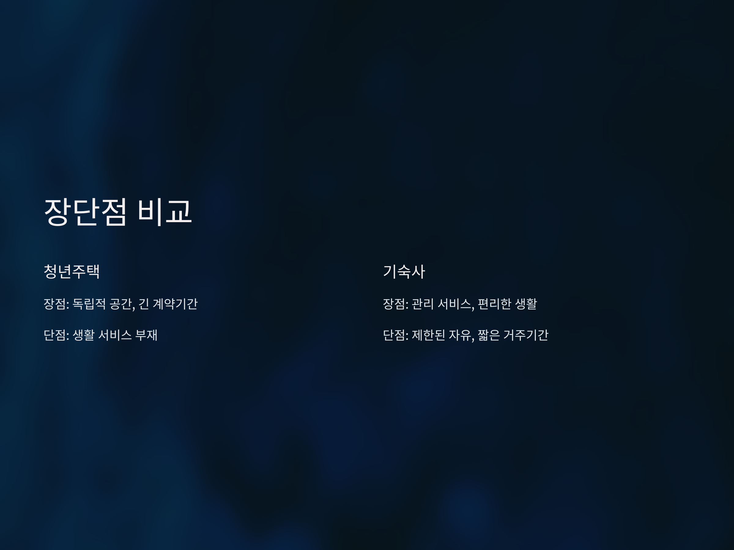 청년주택과 기숙사는 각기 다른 환경과 조건을 제공합니다. 청년주택은 더 독립적이고, 개인적인 공간을 중시하는 사람들에게 적합합니다. 또한, 청년주택은 보통 계약 기간이 길어 안정적인 거주가 가능하며, 주거 환경도 우수한 편입니다. 하지만, 기숙사는 상대적으로 기간이 짧고, 규정이 더 엄격할 수 있으며, 개인적인 자유가 제한될 수 있습니다.
