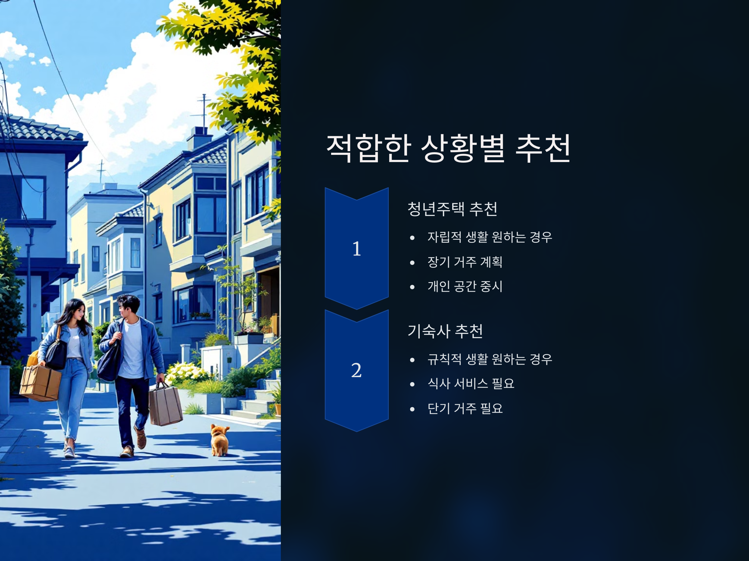 결국, 청년주택과 기숙사 선택은 본인의 상황과 생활 스타일에 따라 다릅니다. 청년주택은 장기적인 안정성을 제공하며, 독립적인 생활을 원하는 청년들에게 적합합니다. 반면, 기숙사는 단기간 내에 안전하고 규칙적인 생활을 원하며, 식사와 청소 서비스가 필요한 경우 유리합니다.