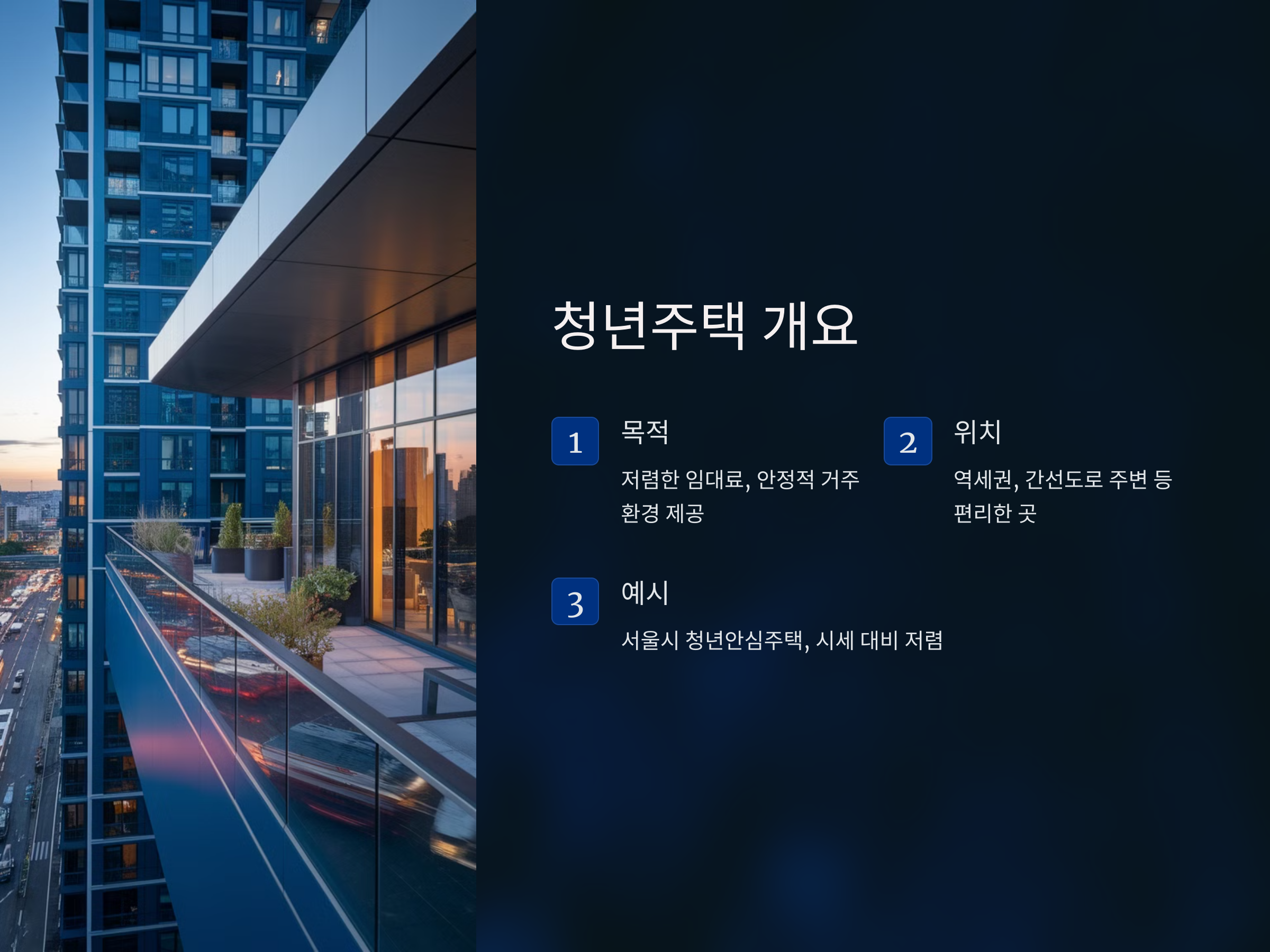 청년주택은 주거비 부담이 큰 청년층을 대상으로 저렴한 임대료와 안정적인 거주 환경을 제공하기 위해 설계된 공공임대주택입니다. 이러한 주택은 대중교통이 편리한 역세권이나 간선도로 주변에 위치하여 청년들의 생활 편의를 높이고자 합니다. 예를 들어, 서울시와 SH서울주택도시공사는 청년안심주택을 통해 시세 대비 저렴한 임대료로 청년들에게 주거 공간을 제공하고 있습니다. citeturn0search3