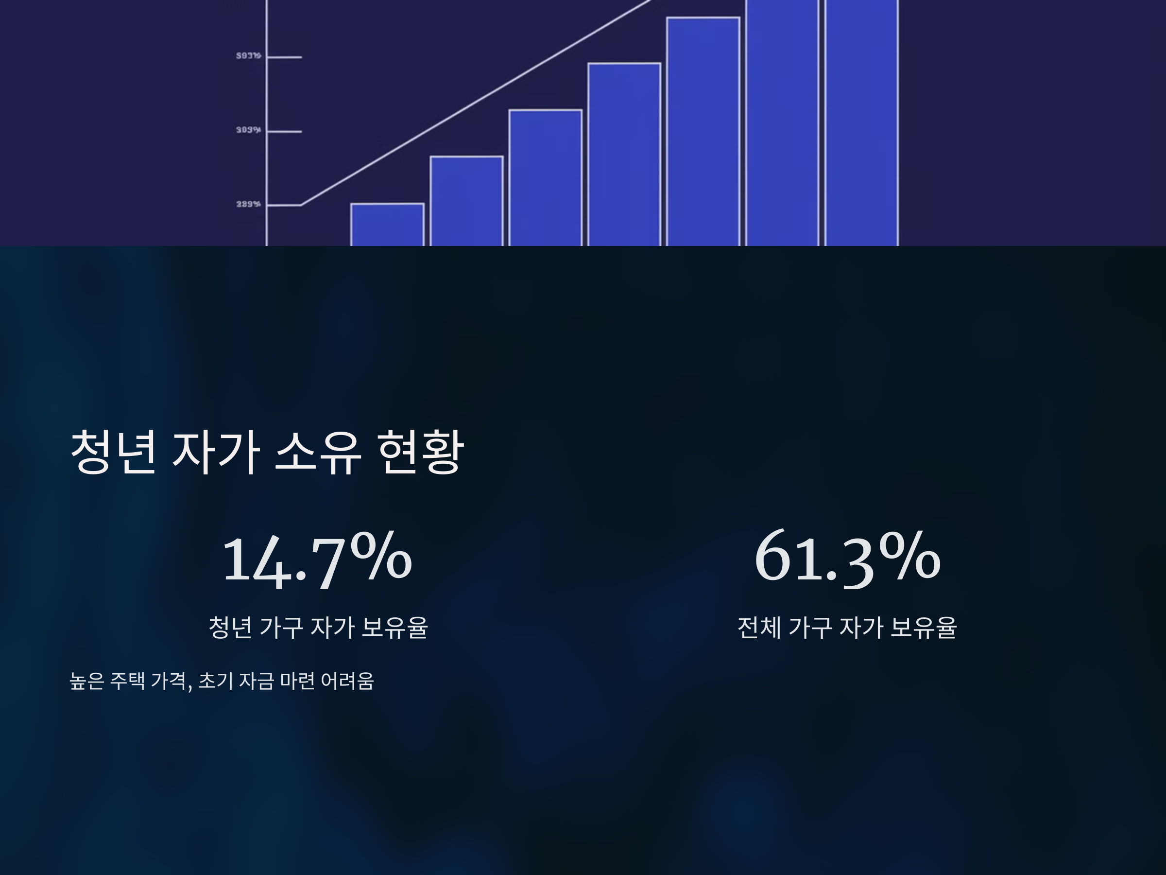 통계에 따르면, 청년 가구의 자가 보유율은 전체 가구에 비해 현저히 낮은 수준입니다. 2022년 기준, 청년 가구의 자가 보유율은 14.7%로, 전체 가구의 자가 보유율인 61.3%에 비해 크게 낮습니다. 이는 높은 주택 가격과 초기 자금 마련의 어려움 등이 주요 원인으로 작용하고 있습니다. citeturn0search8