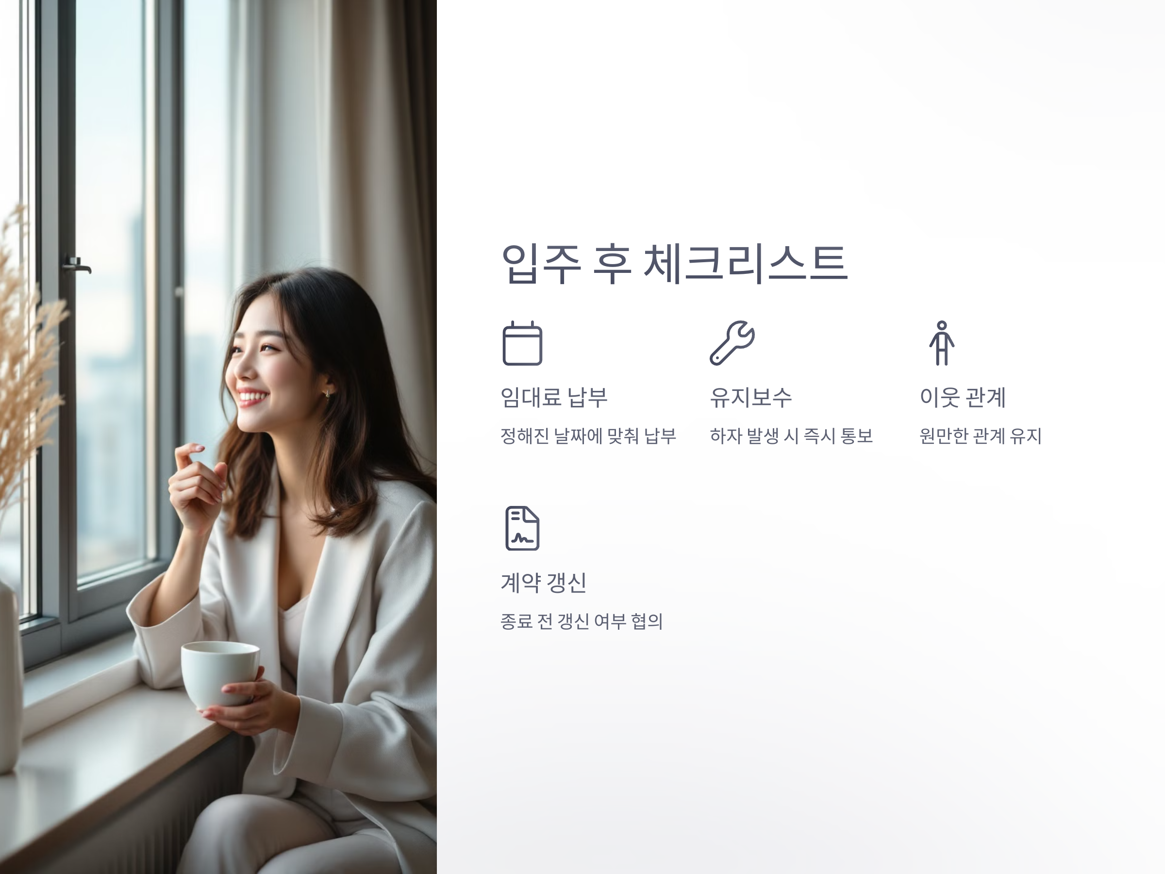 입주 후에는 다음 사항들을 지속적으로 관리해야 합니다:
