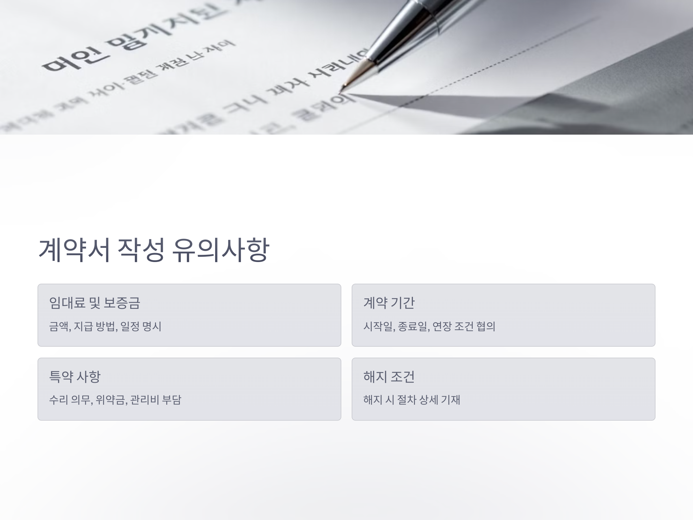 - 특약 사항: 수리 의무, 위약금, 관리비 부담 등 추가로 합의한 내용을 특약 사항으로 명시합니다.