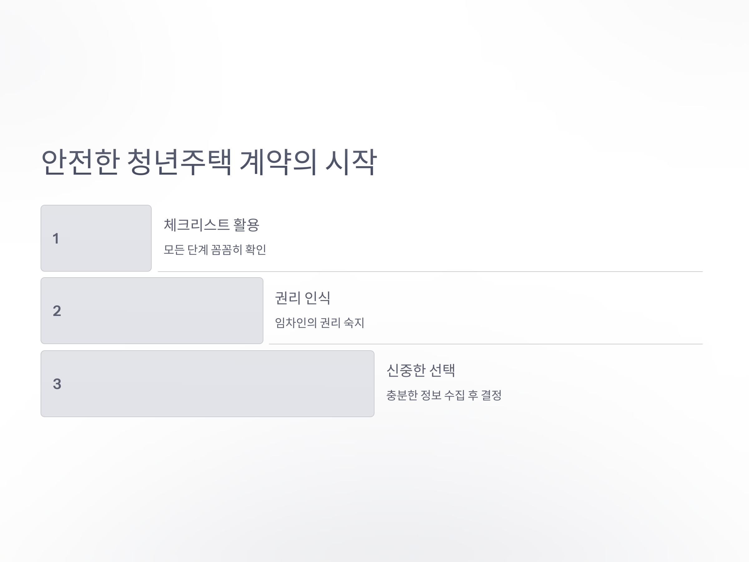 청년주택 계약은 신중함이 요구되는 중요한 절차입니다. 위에 언급한 체크리스트를 참고하여 꼼꼼히 준비하신다면 안전하고 만족스러운 주거 생활을 시작하실 수 있을 것입니다. 항상 계약 전후로 모든 사항을 철저히 확인하고, 궁금한 점이 있다면 전문가의 도움을 받는 것을 추천드립니다.