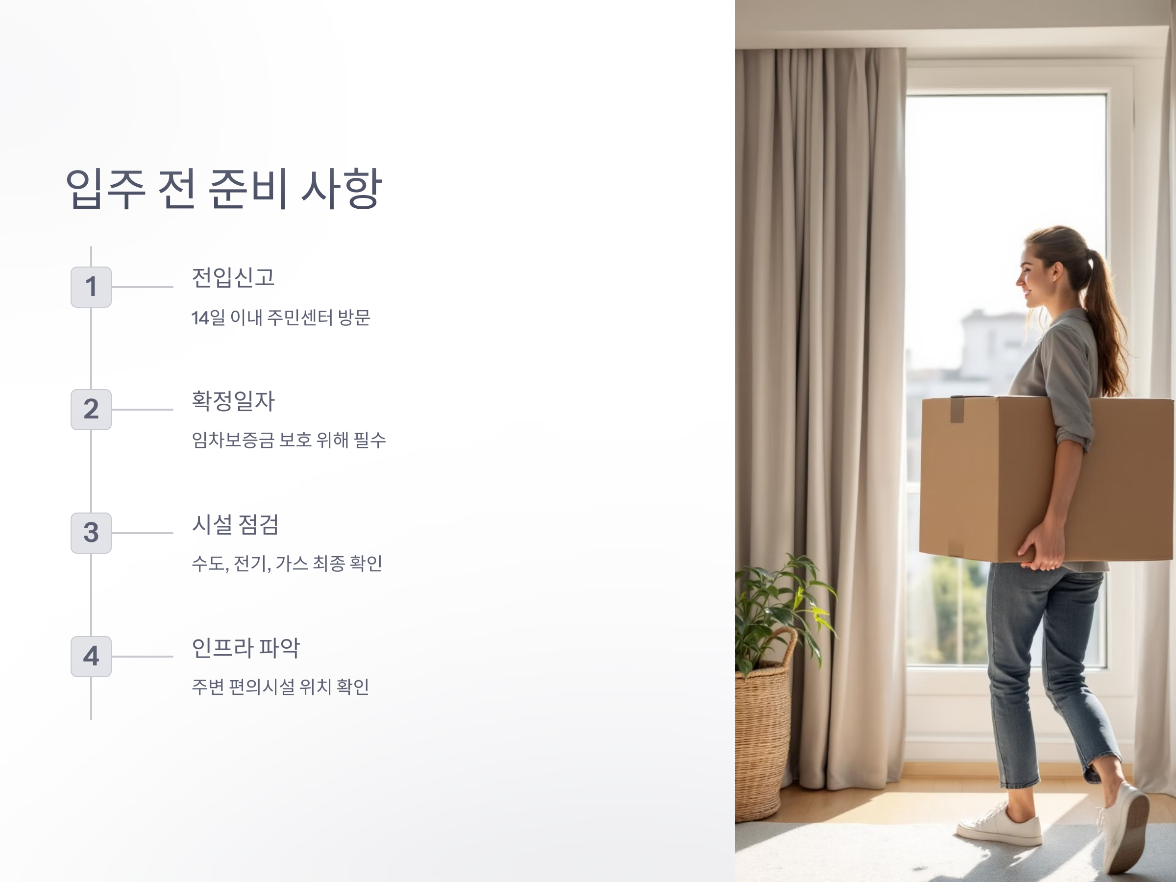- 전입신고: 입주 후 14일 이내에 관할 주민센터에서 전입신고를 완료하여 대항력을 확보합니다.
