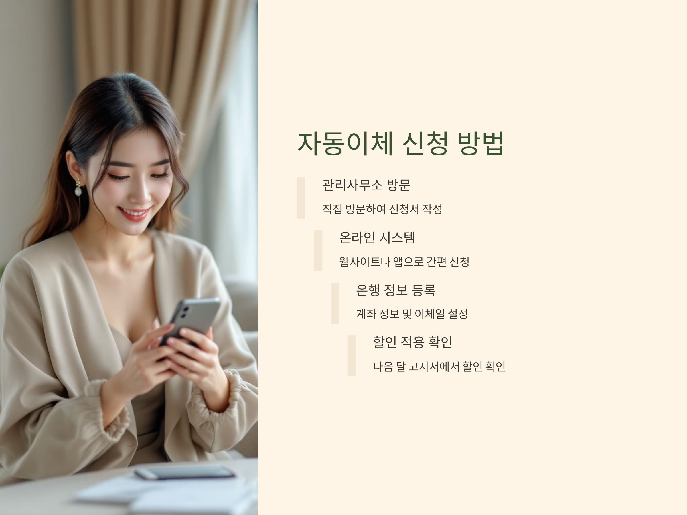 - 미납 방지: 자동이체로 관리비를 납부하면 미납으로 인한 불이익을 피할 수 있습니다. 예를 들어, 미납 시 연체료가 발생하거나, 계약 해지 등의 문제가 발생할 수 있는데, 자동이체를 설정하면 이를 방지할 수 있습니다.