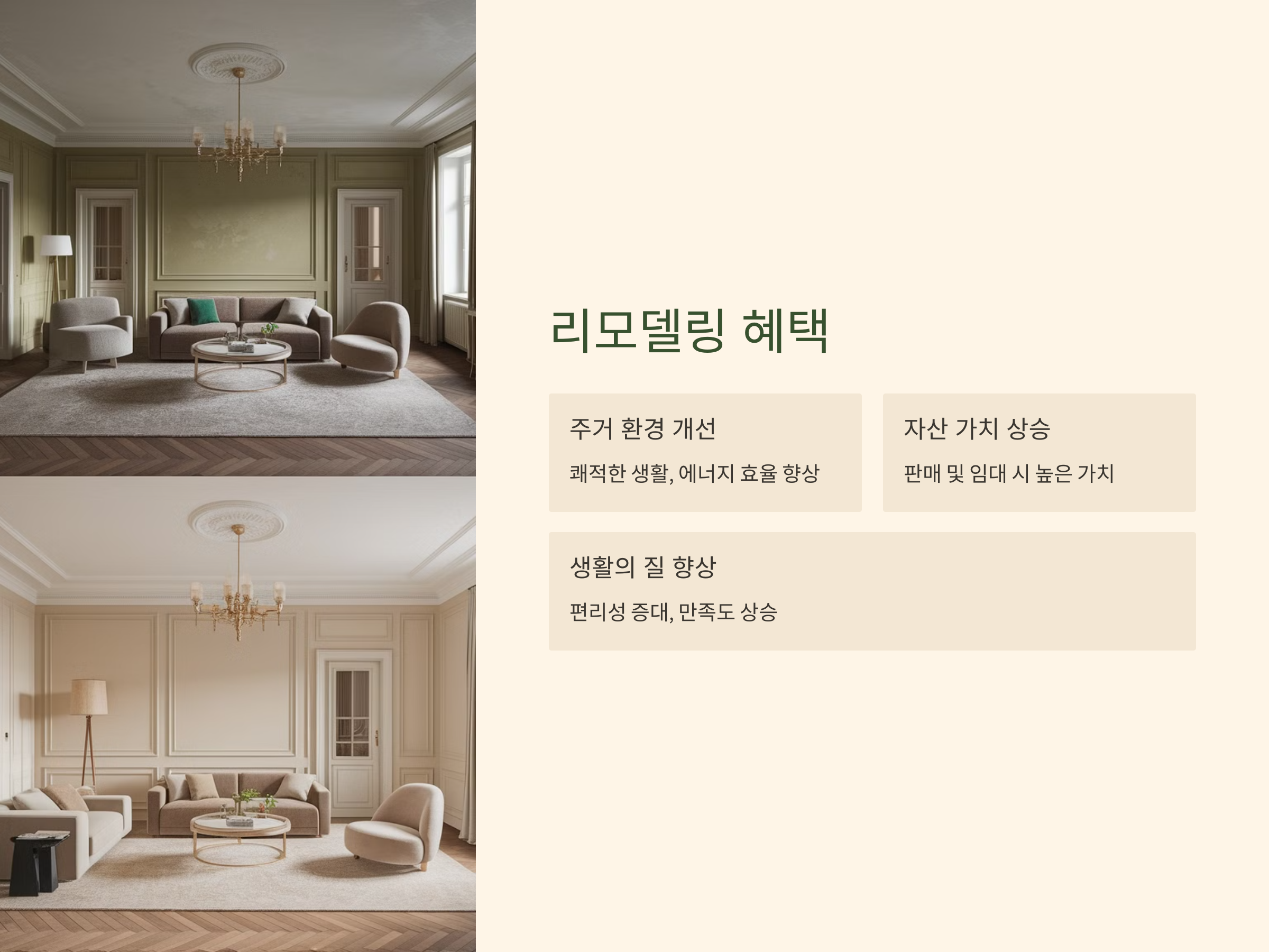 리모델링을 통해 공간을 효율적으로 재배치하거나, 인테리어를 현대적인 스타일로 바꾸면 주거 환경이 훨씬 쾌적해집니다. 또한, 최신 기술을 적용해 에너지 효율이 높아지면, 난방 및 냉방 비용도 절감할 수 있습니다.