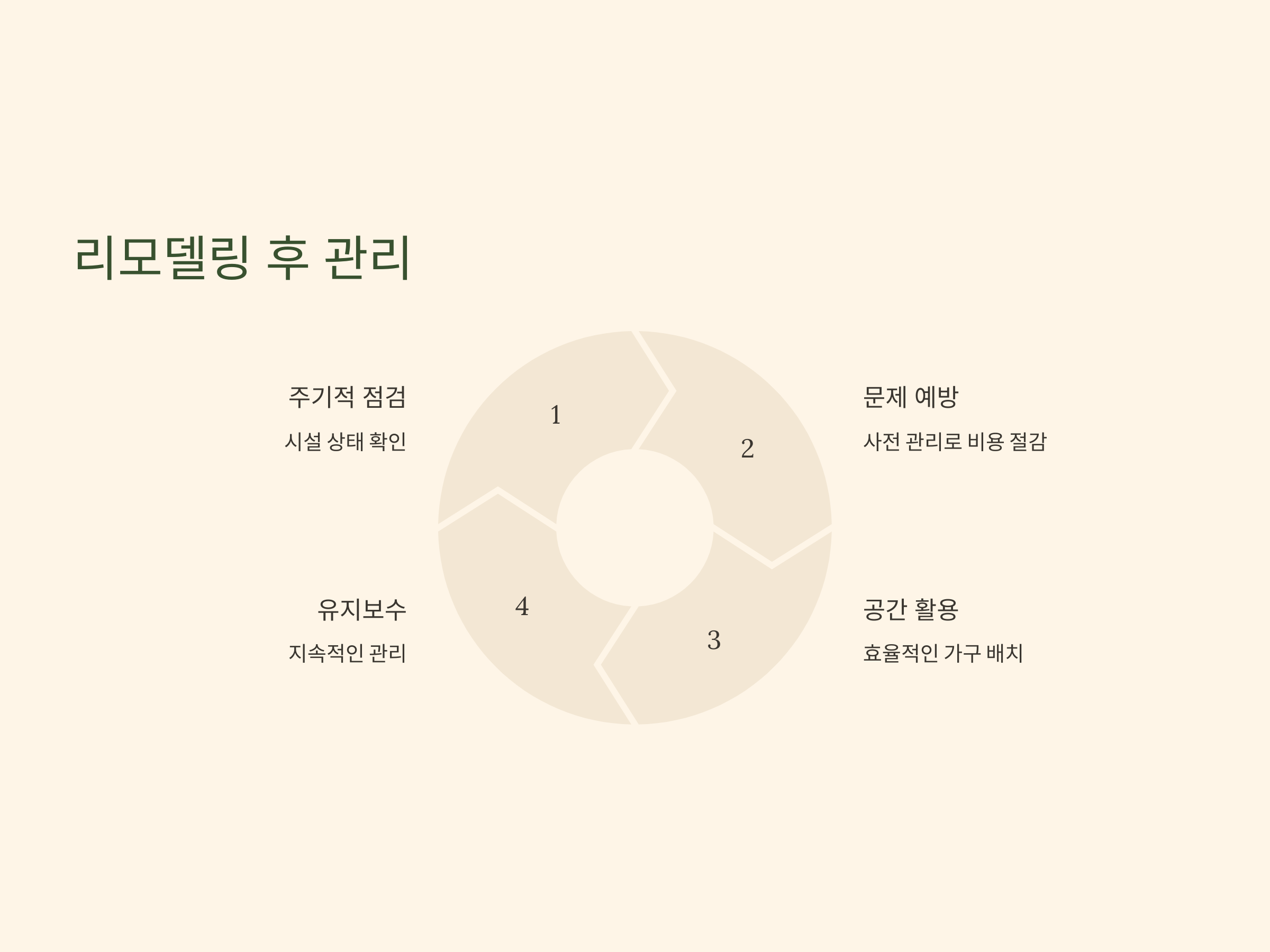 리모델링 후에는 기기나 인테리어 상태가 잘 유지되고 있는지 주기적으로 점검해야 합니다. 특히, 배관이나 전기 시설 등의 안전성을 확인하고, 문제가 발생하기 전에 사전에 예방하는 것이 중요합니다.