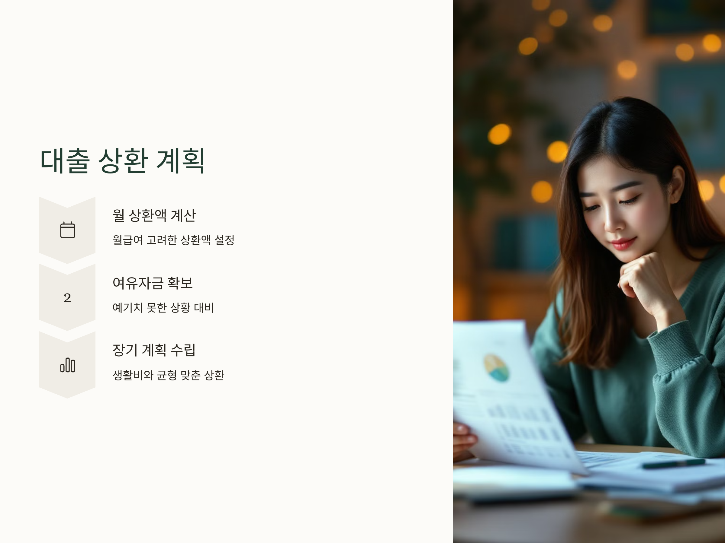 상환 계획을 세울 때 중요한 것은 매월 상환할 금액을 충분히 예측하고, 여유자금을 확보하는 것입니다. 예기치 못한 상황에 대비할 수 있도록 자금 계획을 철저히 세우는 것이 좋습니다.