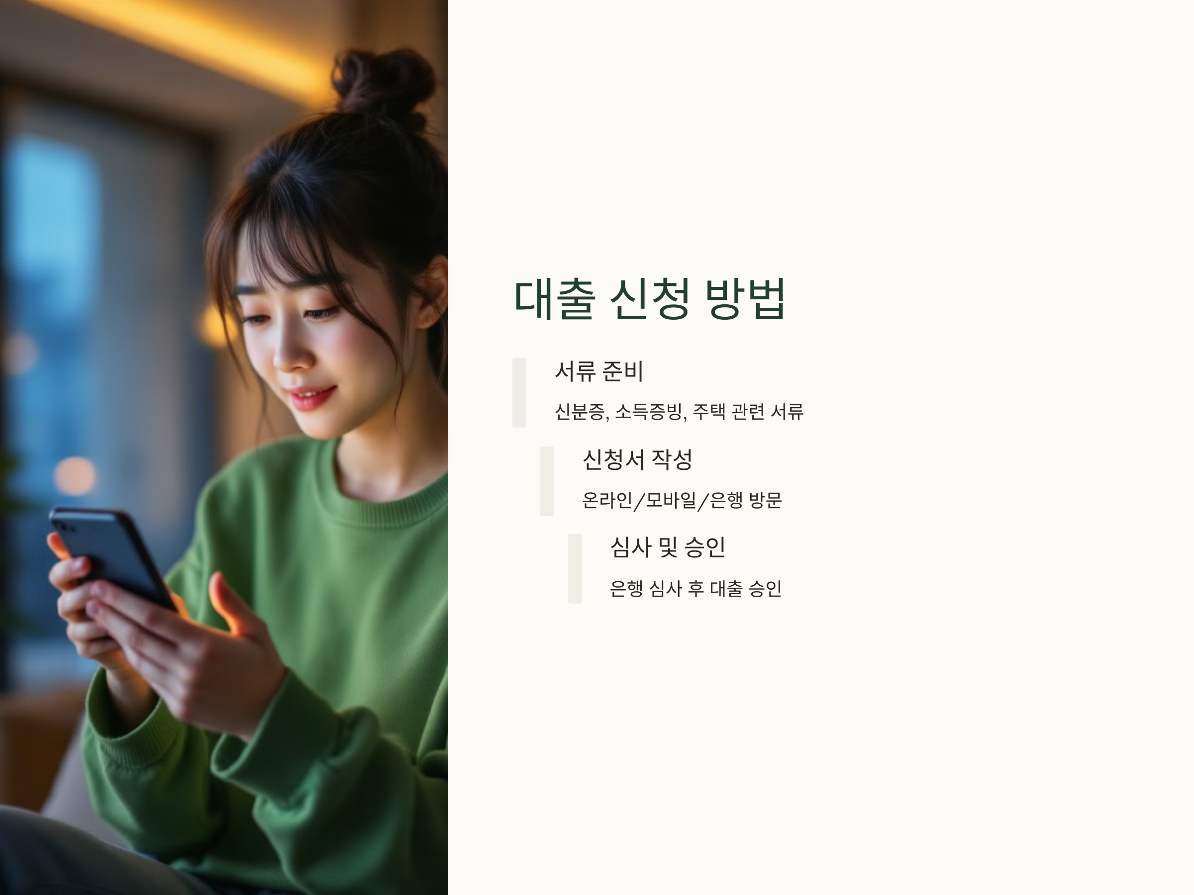 대출 신청을 위해서는 본인의 신분증, 소득 증빙 서류, 그리고 주택 관련 서류(임대차 계약서 등)를 준비해야 합니다. 필요한 서류를 빠짐없이 준비한 후, 대출 신청서를 작성하고 제출하면 대출 승인이 이루어집니다.
