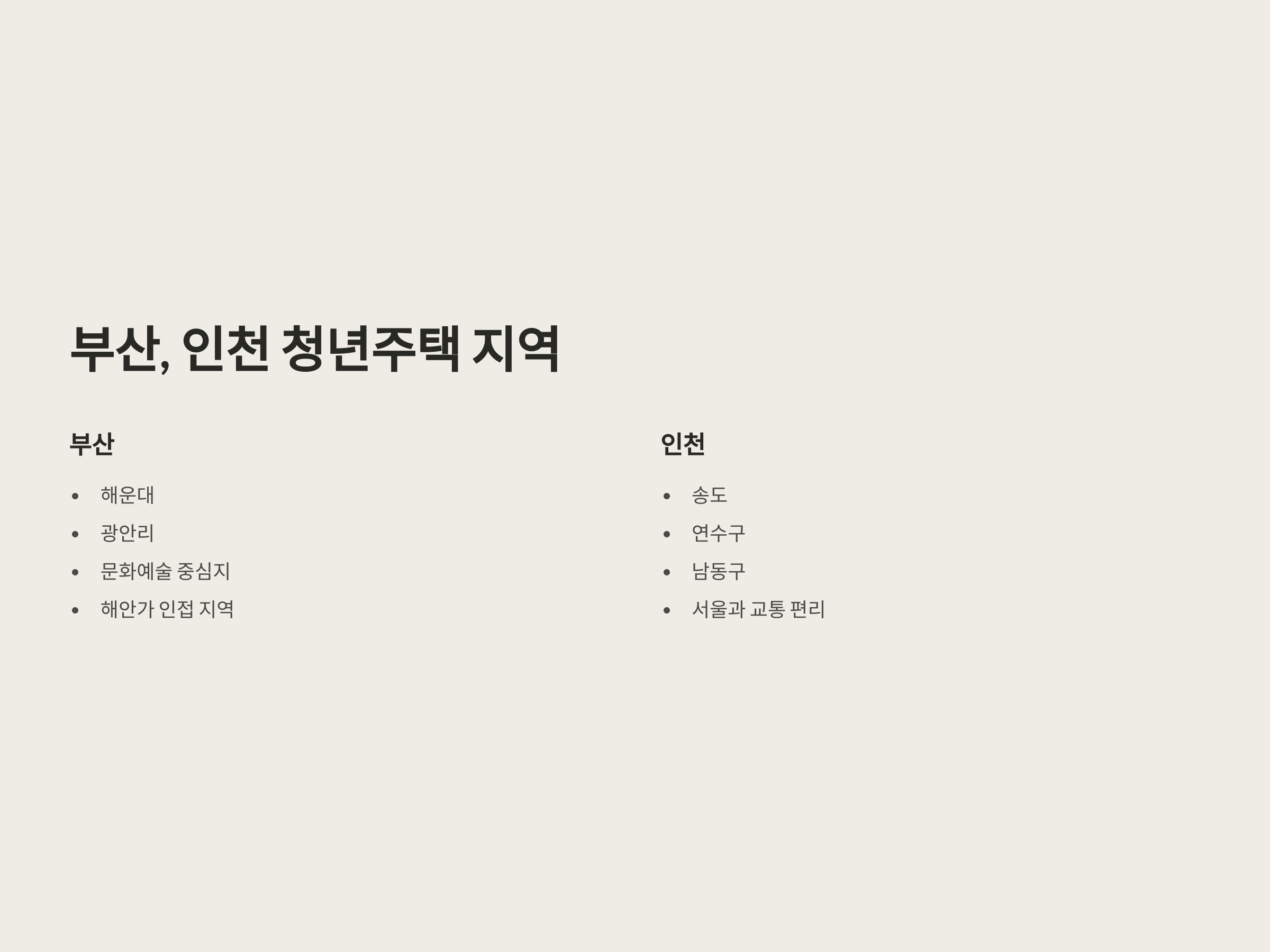 부산은 문화와 예술의 중심지로 알려져 있어, 많은 청년들이 예술적인 활동을 하기에 적합한 환경을 제공합니다. 또한, 인천은 서울과의 교통이 편리하며, 다양한 기업들이 위치해 있어 일자리도 많고, 생활비가 상대적으로 저렴한 장점이 있습니다. 이러한 지역들에서는 청년들을 위한 청년주택 공급이 적극적으로 이루어지고 있으므로, 청년들에게 적합한 거주지를 제공하는 곳이 많습니다.