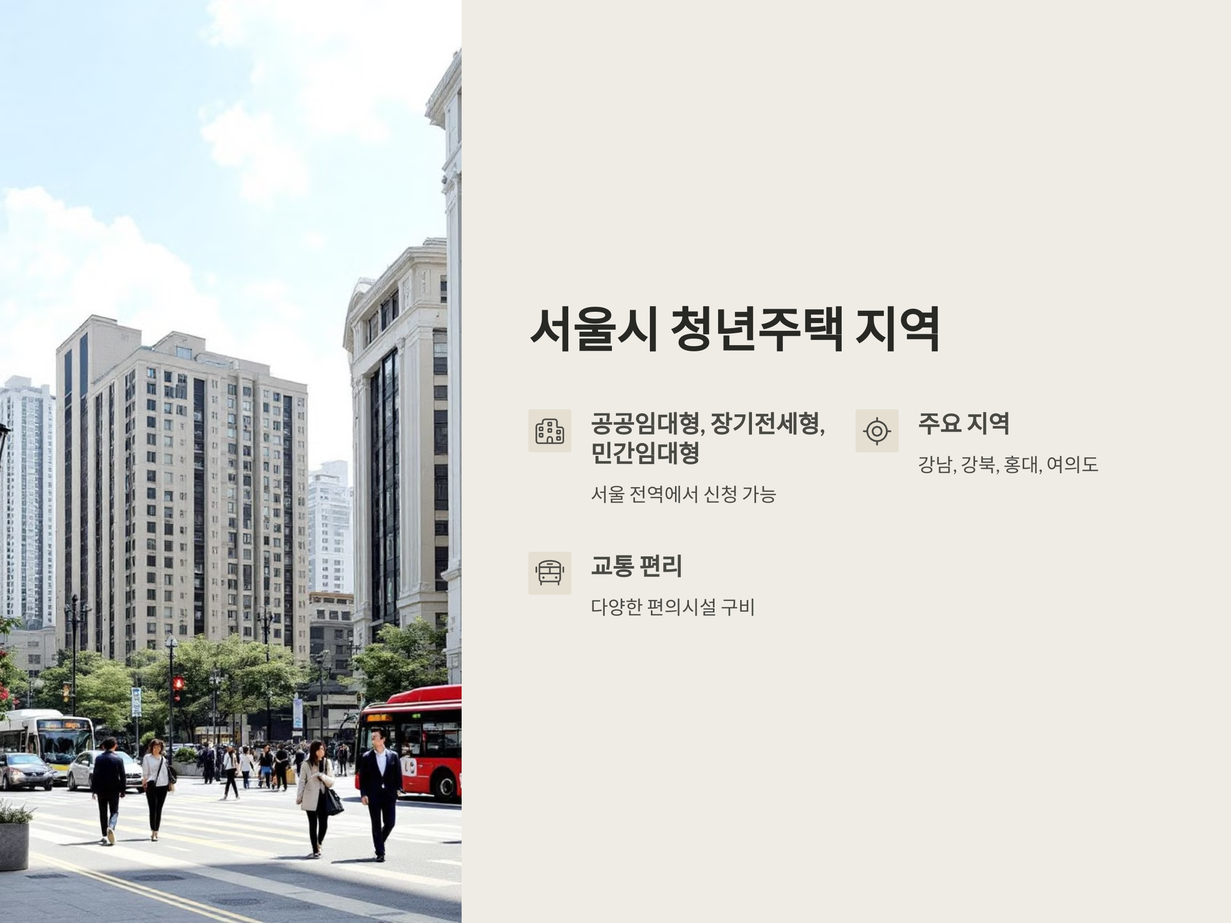 서울 내 주요 청년주택 신청 가능 지역으로는 강남, 강북, 홍대, 여의도 등 여러 지역이 포함됩니다. 특히 강남과 강북은 교통이 편리하고, 다양한 편의시설이 있어 청년들에게 인기 있는 지역입니다. 이 외에도 청년들이 선호하는 지역은 점차 확대되고 있으므로, 지속적으로 해당 지역의 정보를 확인하는 것이 좋습니다.