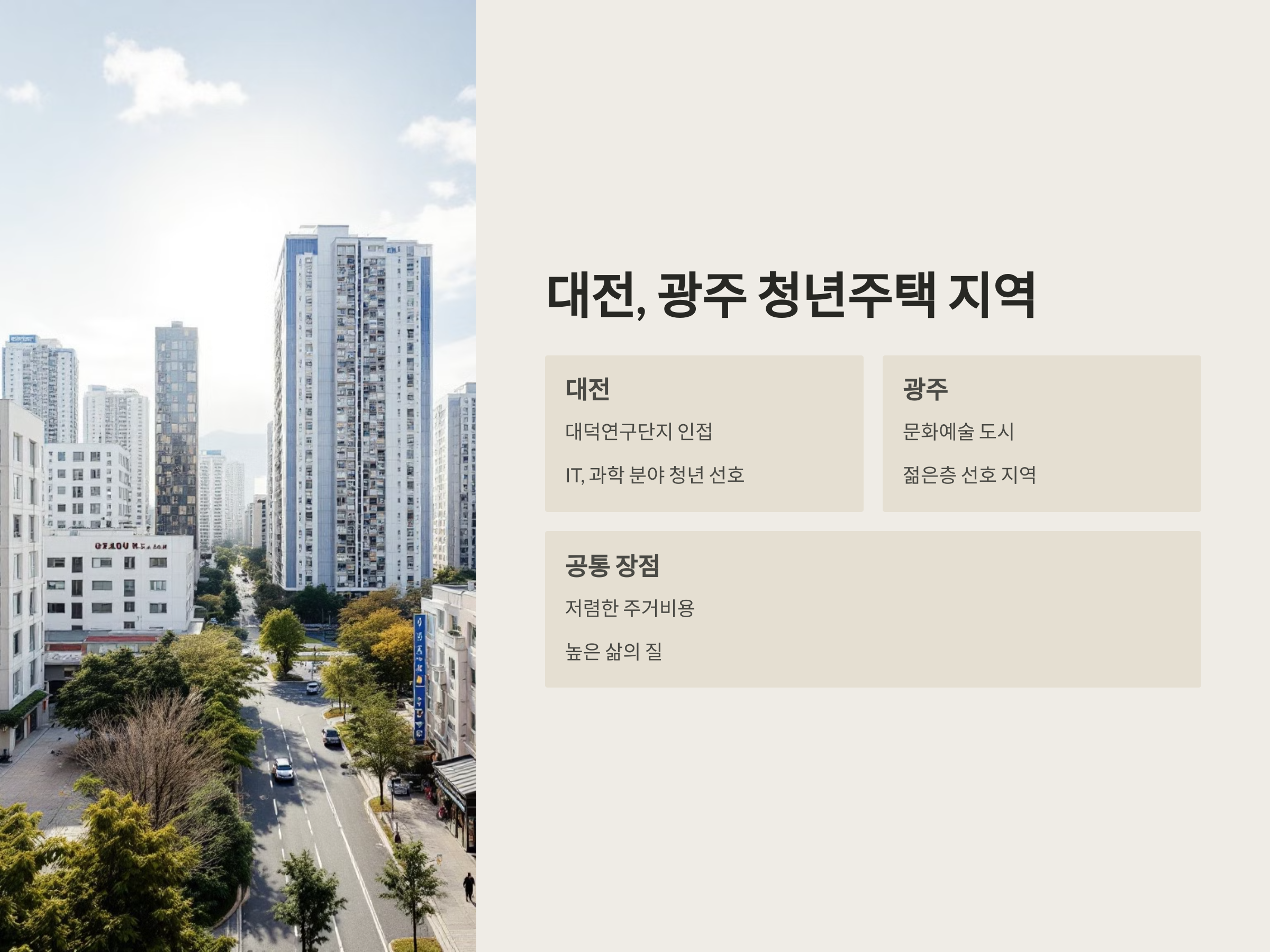 대전과 광주도 청년주택 신청 가능 지역으로 주목받고 있습니다. 대전은 대덕연구단지와 첨단산업단지가 밀집해 있어 IT와 과학 분야에서 일하는 청년들이 많습니다. 또한, 광주는 다양한 문화와 예술이 결합된 도시로 많은 젊은 층들이 선호하는 지역입니다. 이 두 도시는 수도권에 비해 상대적으로 저렴한 주거비용과 높은 삶의 질을 제공하기 때문에, 청년들이 거주하기에 매우 적합한 곳입니다.