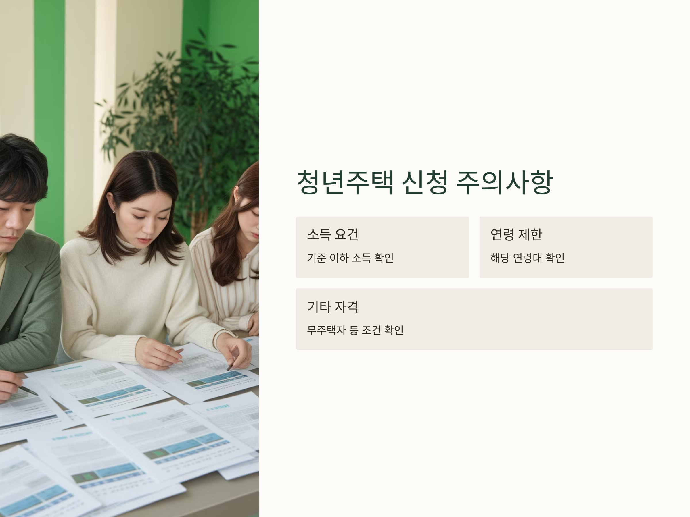 - 소득 요건 충족: 청년주택의 경우 일정 소득 이하의 청년만 신청할 수 있으므로, 소득이 기준을 초과하지 않는지 확인해야 합니다.