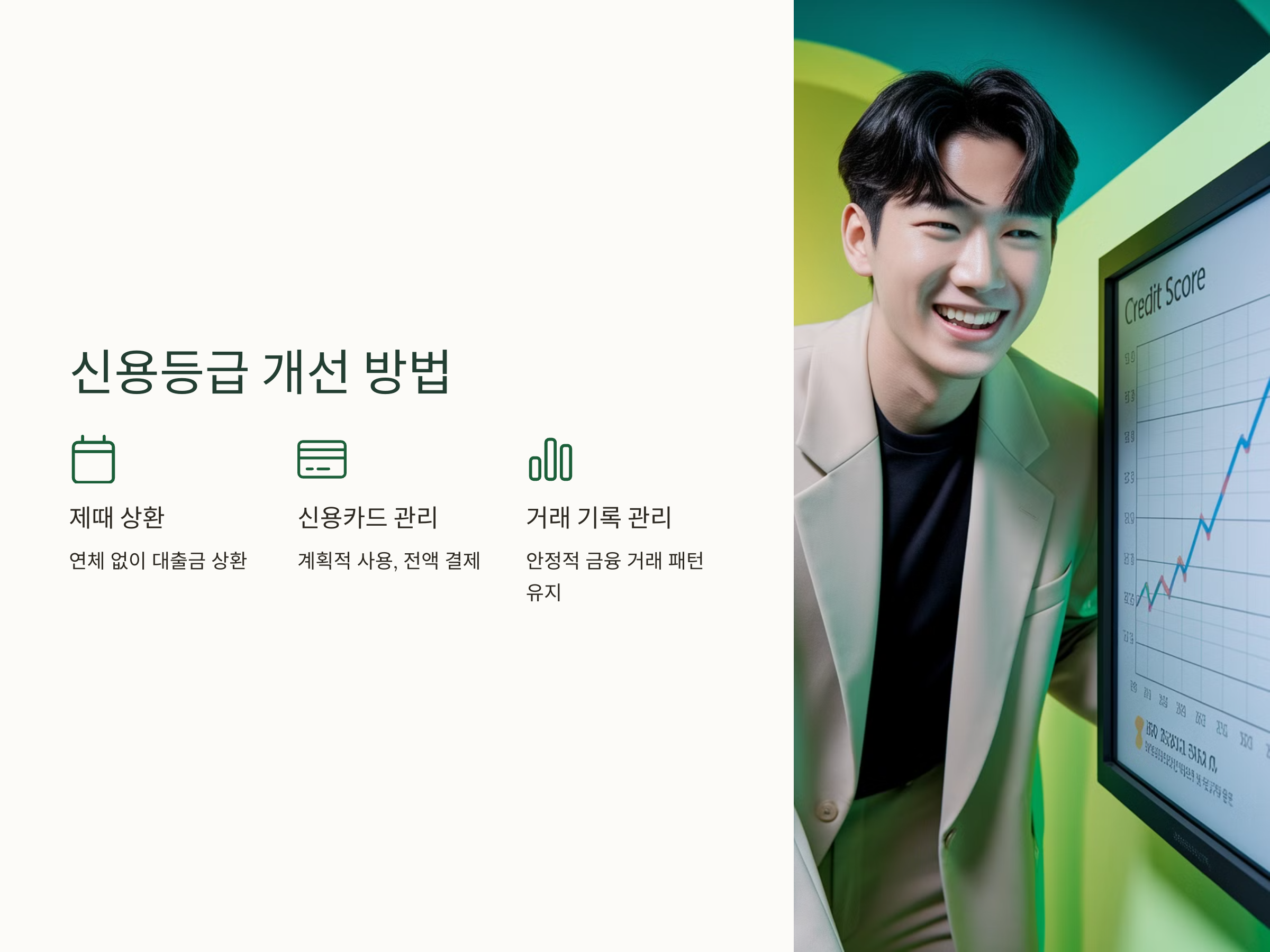 - 대출 상환: 기존의 대출이 있다면 제때 상환하는 것이 중요합니다. 연체가 없으면 신용등급이 점차 개선됩니다.