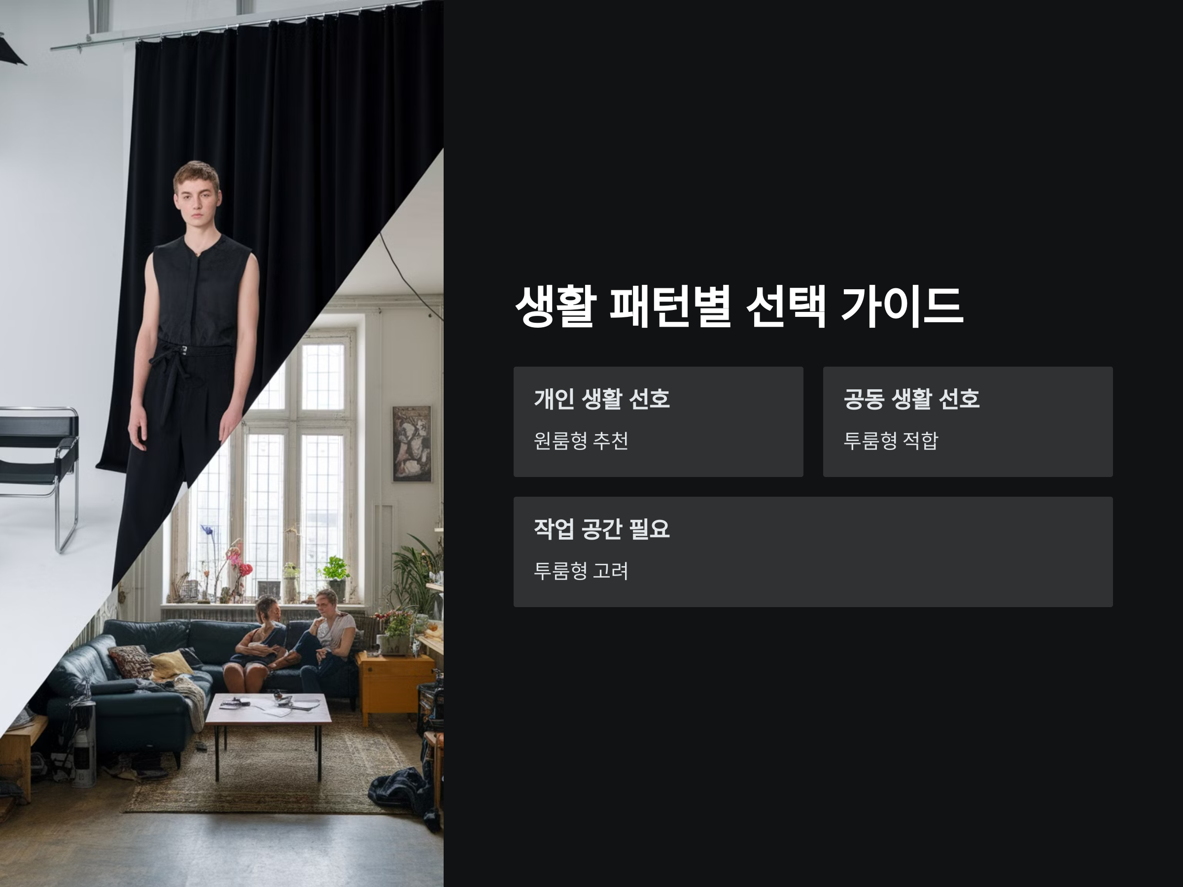 - 공동 생활 선호자: 친구나 동료와 함께 생활하거나, 별도의 작업 공간이 필요하다면 투룸형이 더 나은 선택이 될 수 있습니다.