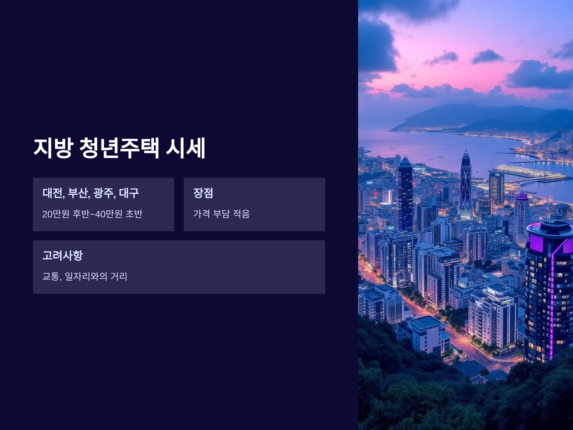 지방은 서울과 수도권에 비해 청년주택의 수요가 상대적으로 적지만, 그만큼 시세가 낮은 편입니다. 지방 중에서도 대전, 부산, 광주, 대구 등 주요 도시에서는 청년주택이 많이 공급되고 있으며, 시세도 매우 합리적입니다. 예를 들어, 대전의 청년주택은 20만 원대 후반에서 40만 원대 초반으로 공급되고 있으며, 부산 역시 비슷한 시세를 유지하고 있습니다. 지방의 청년주택은 서울과 수도권보다 가격 부담이 적어, 청년들이 주거 비용을 절약하고자 할 때 좋은 선택이 될 수 있습니다.