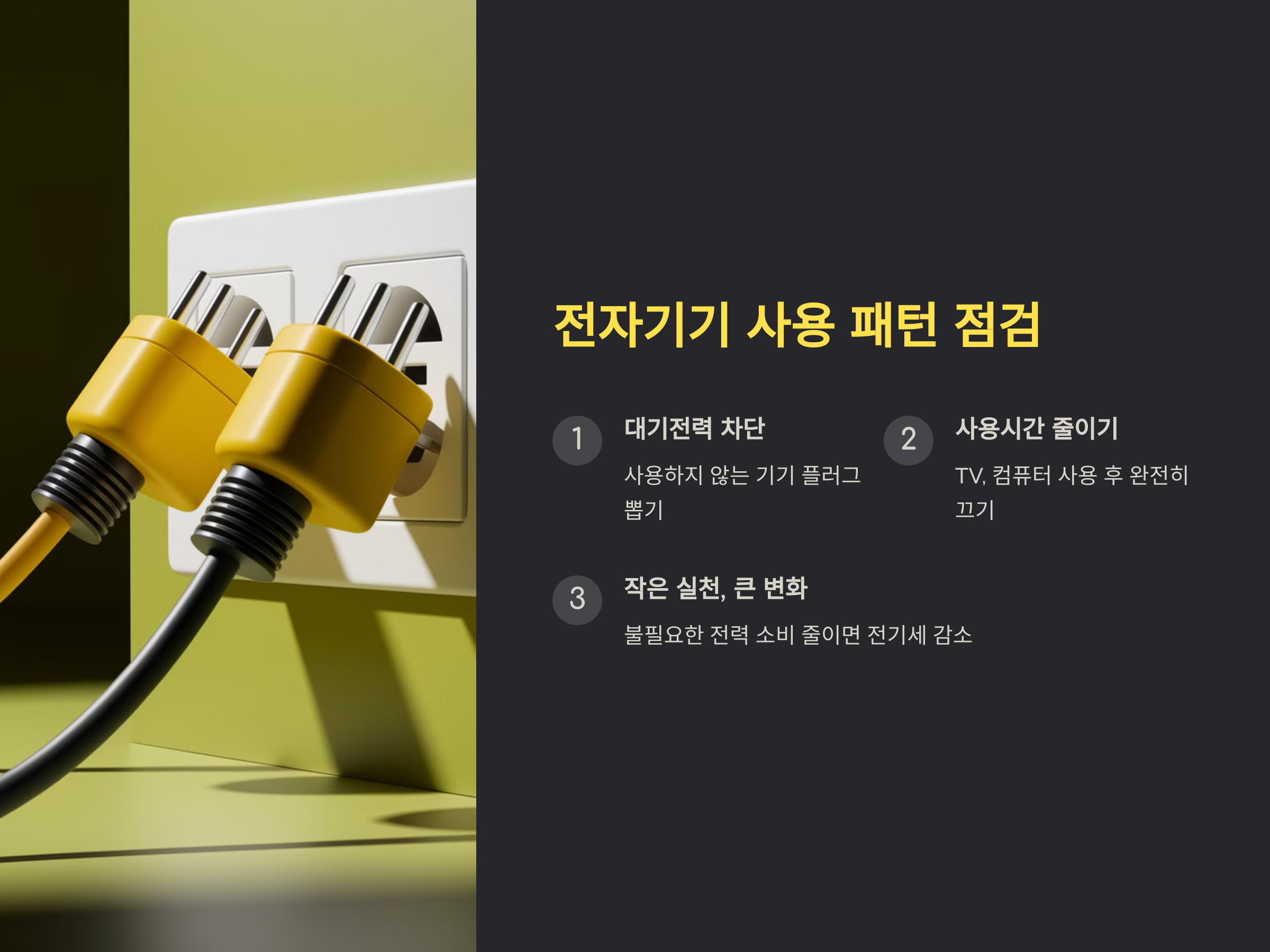 첫 번째는 전자기기를 사용하지 않을 때는 반드시 플러그를 뽑는 것입니다. 많은 사람들이 기기 사용 후에도 그대로 두거나 대기 상태로 두는데, 이때도 전기가 계속 흘러가며 불필요한 전기세를 유발합니다. 두 번째는 전자기기 사용 시간을 최대한 줄이는 것입니다. 예를 들어, TV나 컴퓨터를 사용하지 않을 때에는 꺼두는 습관을 들이거나 스마트폰 배터리를 절약하는 방법을 익히는 것도 큰 도움이 됩니다.